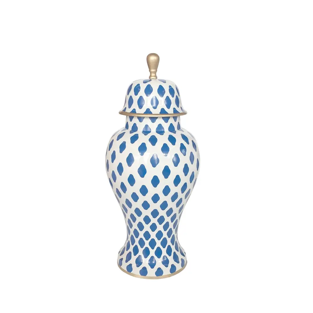 This handpainted jar in Dana Gibsons's signature 'Parsi' pattern will add a pop of graphic pattern and color. Colors: Blue and White Materials: Aluminum Removable lid Dimensions:16"H Free shipping in the U.S.