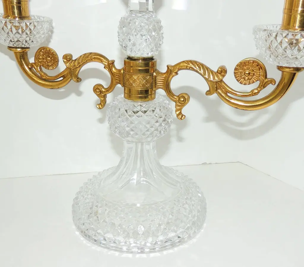 These elegant candelabras have a wonderful spire in the center and beautiful cut crystal that shimmers in the candlelight. The Doré bronze center is intricately decorated with scrolls accenting the arms. In the style / manner of BaccaratMeasures: 19" H x 12" W on 5.5" crystal pedestalTotal of two pairs available, Each pair sold separately.