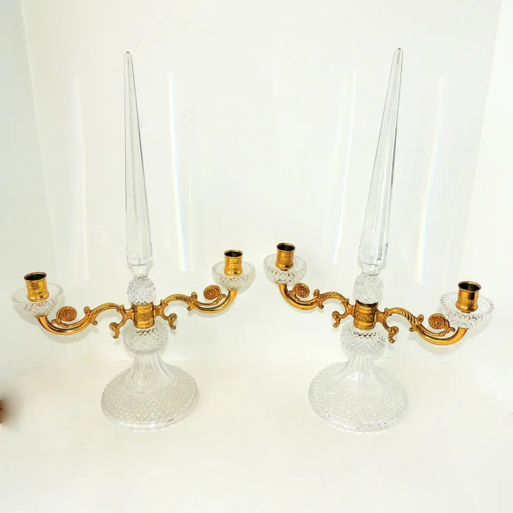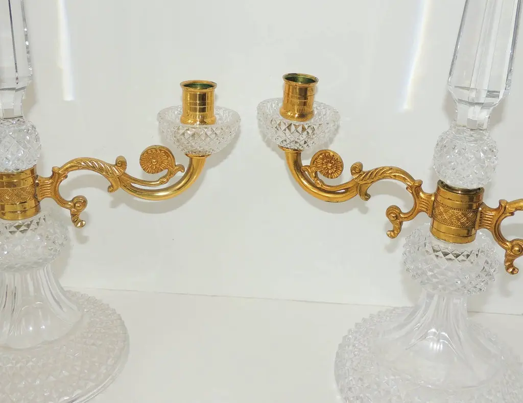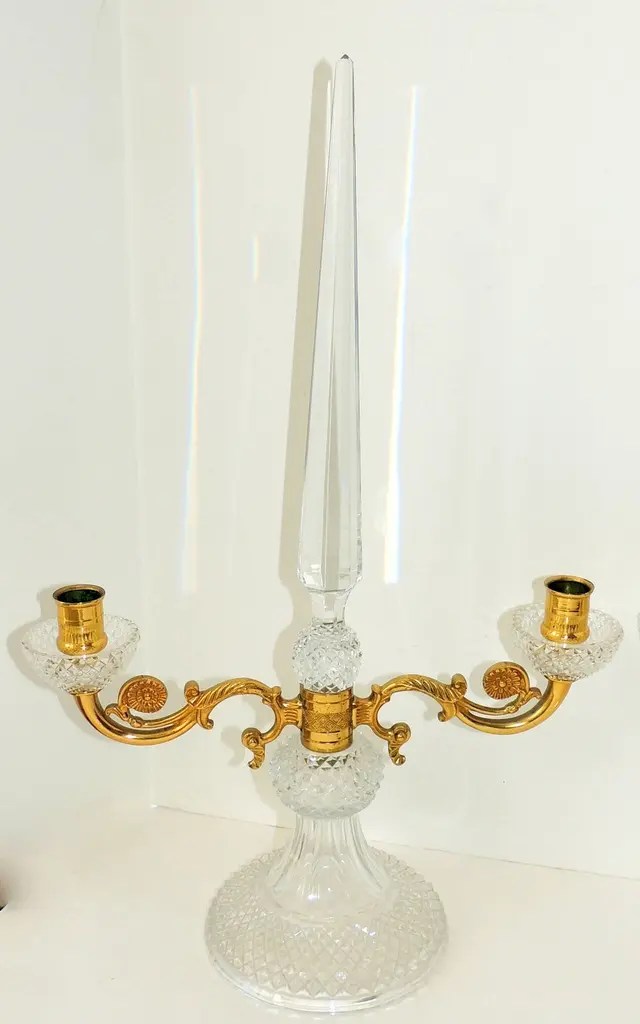 Elegant Pair French Baccarat Cut Crystal Doré Bronze Ormolu Obelisk Candelabras