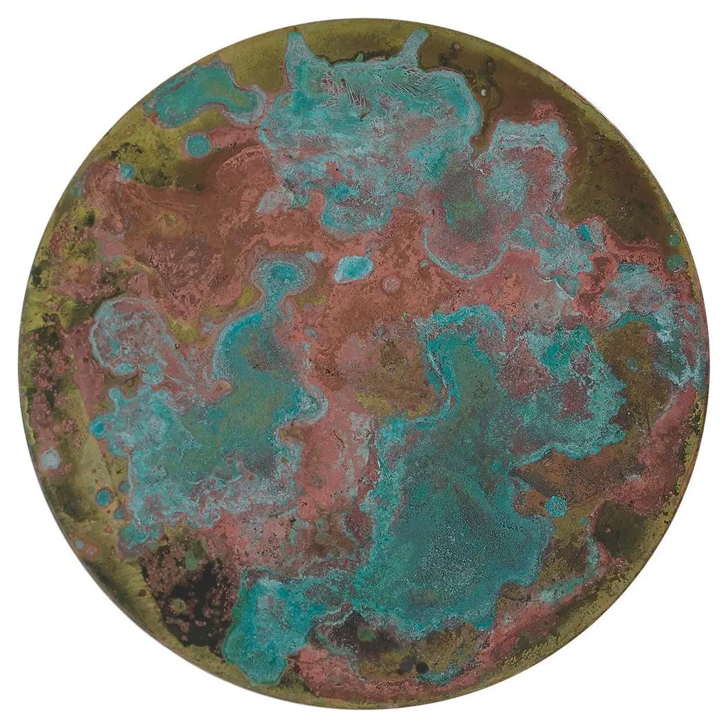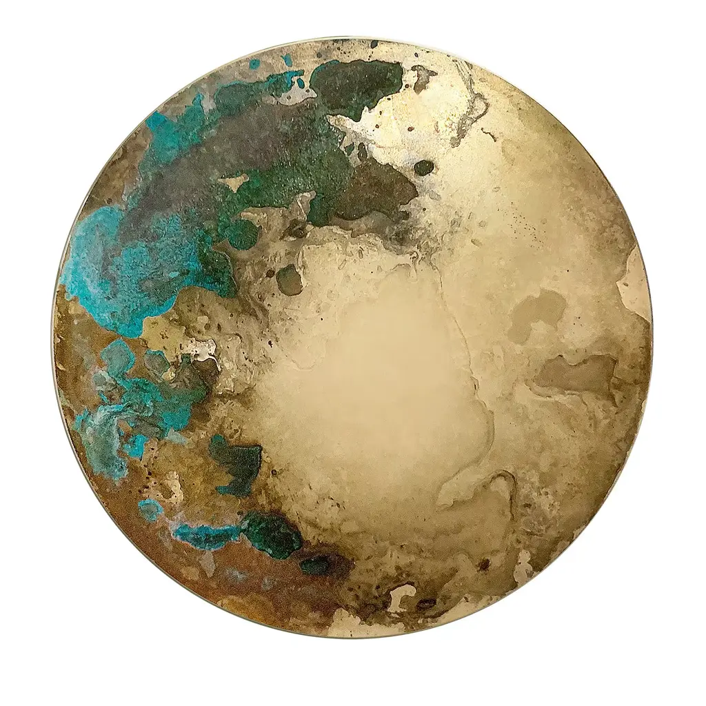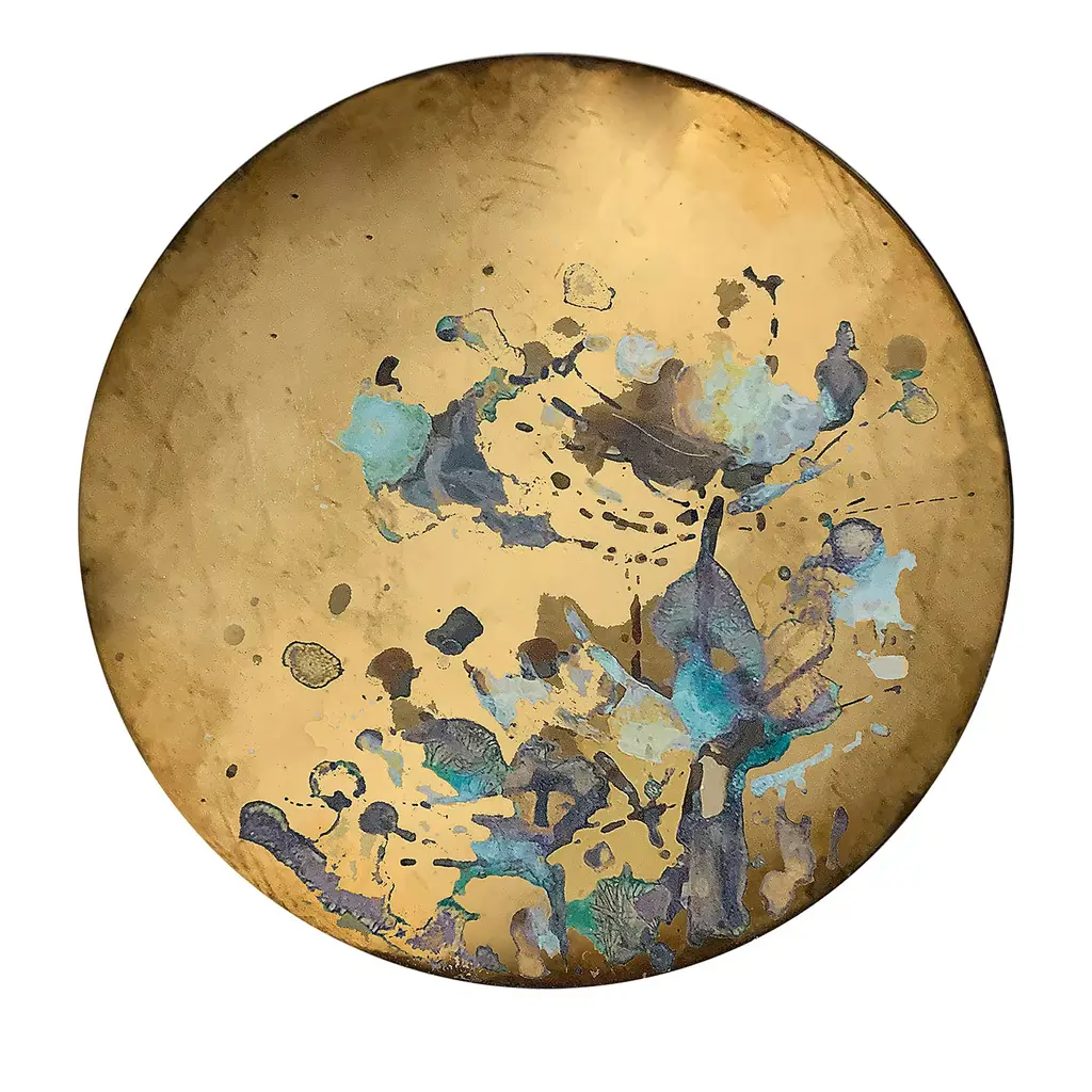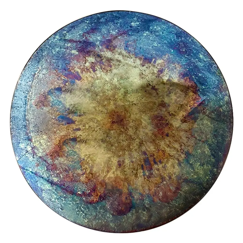 A decorative nickel silver disk standing out for a blotched motif obtained with the interaction between different chemical reagents marks this singular handmade piece. Part of a series inspired by the philosophical concept of heterotopia developed by Michel Foucault in the '60s, it mesmerizes with its unrepeatable and unpredictable specks ranging from midnight-blue to white.