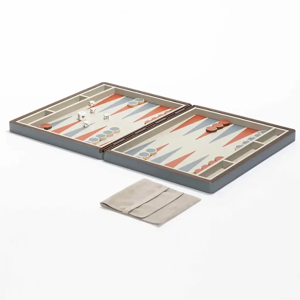 This stunning backgammon box is the ultimate gift for a game lover and a superb decorative object for any interior. Its functional structure is in Travertino marble, with a reversible leather pad showing on one side an inlaid playing field and on the other a simple monochromatic surface. It comes with a wooden box upholstered in leather with a matching marble lid and playing accessories: maple and walnut pawns with leather inserts, two dice cups, four dice, and a doubling cube. This stunning place is also available in Arabescato white, green Guatemala, Eramosa brown, and black Portoro.