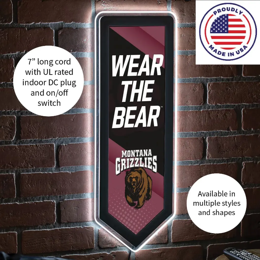 Let your school spirit shine bright with this University of Montana Pennant LED Wall Decor. Enjoy an illuminating design featuring the official logo and colors of your favorite NCAA team. This high-quality piece has a unique pennant shape with an HD digitally printed faceplate. It features full-edge lighting and a fully backlighted faceplate so you can support your favorite team in glowing style. Use for seasons to come as the energy-efficient LED lighting lasts up to 50,000 hours! Made of aluminum and acrylic, this wall decor is for indoor use only, making it perfect for display in a man cave, office, dorm room, and more. Includes pre-drilled holes for easy mounting and a power chord that you can plug into the wall for immediate display. Simply turn on using the On/Off switch. This wall decor is a must-have addition to any passionate fan's collection and also makes a great gift for Christmas, Father's Day, or a birthday. All manufacturing, assembly, and packaging take place in the USA.