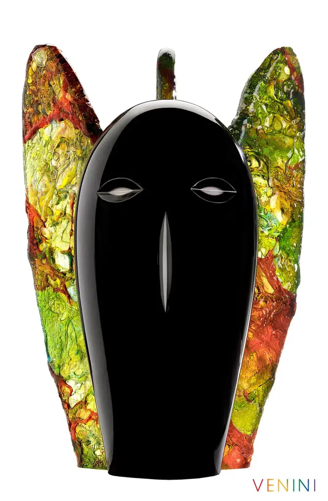 Giotto is an opal blown glass ornament with hot decoration and engraving. An austere face, halfway between ancient and modern, strong and fragile. Giotto by Alessandro Mendini is a winged lord who is destined to hold our gaze. A psychic being whose narrow eyes tell an unspoken tale: perhaps it is a talisman or an omen for art, or maybe it is the custodian of the mysteries and elegance of Italian creativity.Colors: BlackLimited Edition of 119 works numbered in Arabic numerals + 5 in Roman numerals