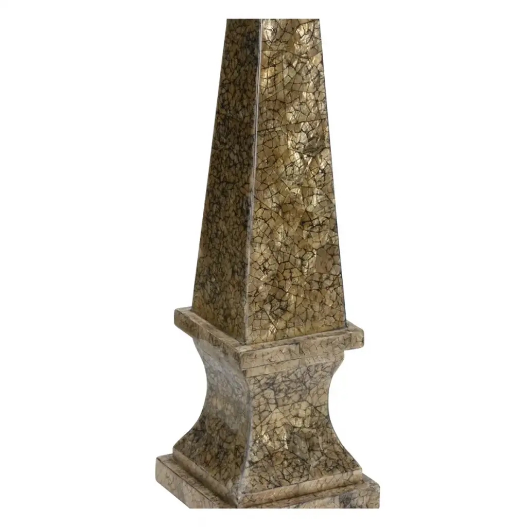 The Gold Obelisks feature exquisite capiz shell inlays in multiple sizes and colors, creating a mesmerizing display of light and texture. Crafted with a sturdy base and a tapering pyramid shape, evoking the grandeur and mystique of ancient Egyptian architecture.