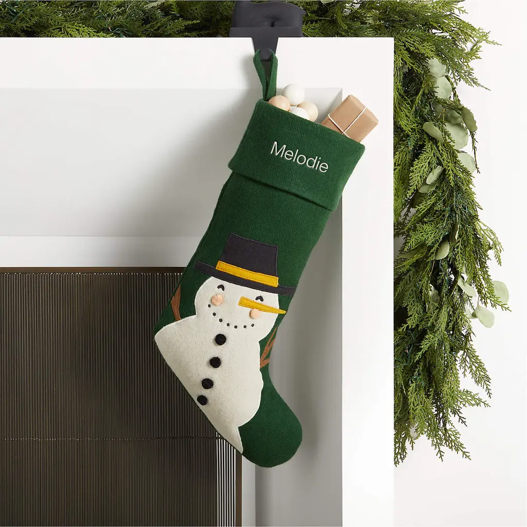 Delightful 3D details, bold colors and vintage charm give our felt kids' Christmas stockings their playful wow factor. This dark green stocking features an appliqué of a smiling snowman with a black hat, rosy pink cheeks, black pom-pom buttons and a yellow carrot nose. He looks perfectly happy to keep watch over the gifts stuffed inside. For a personal touch, the broad cuff can be embroidered with a name or initials.