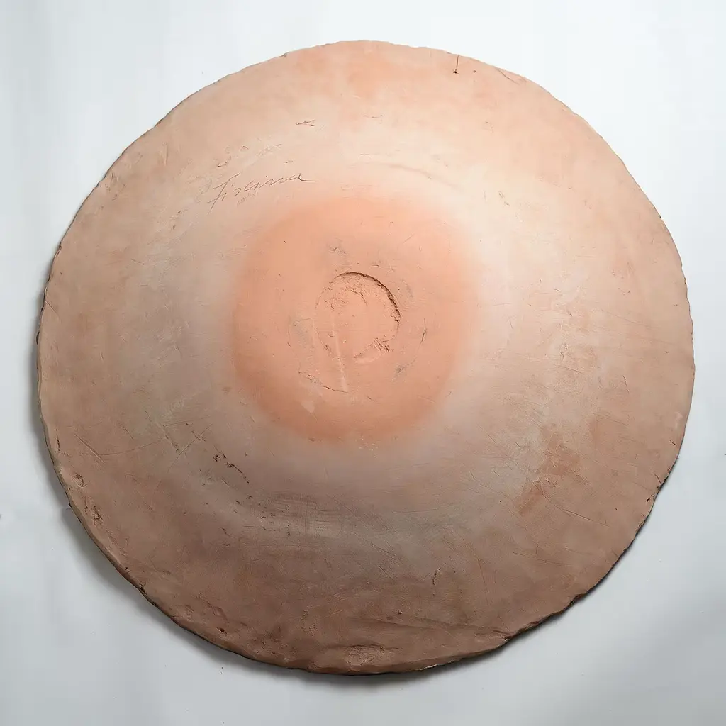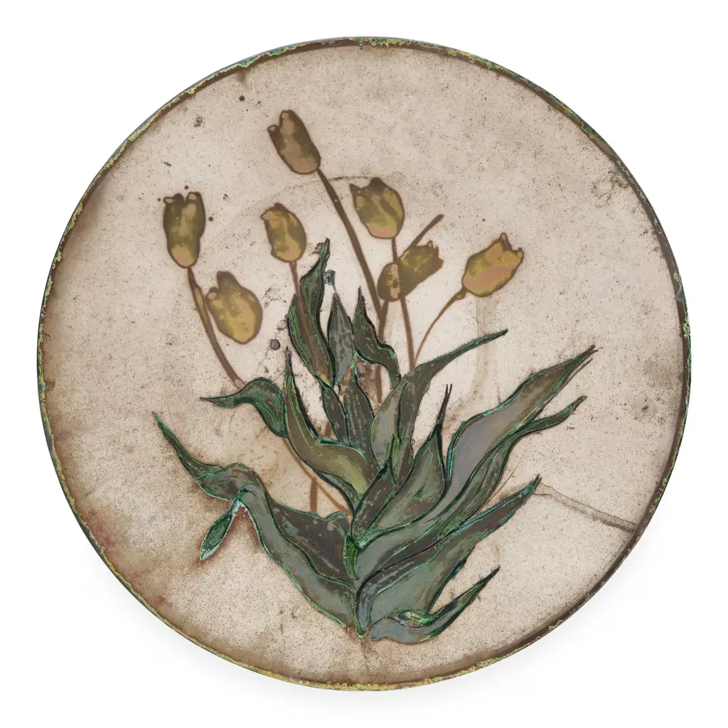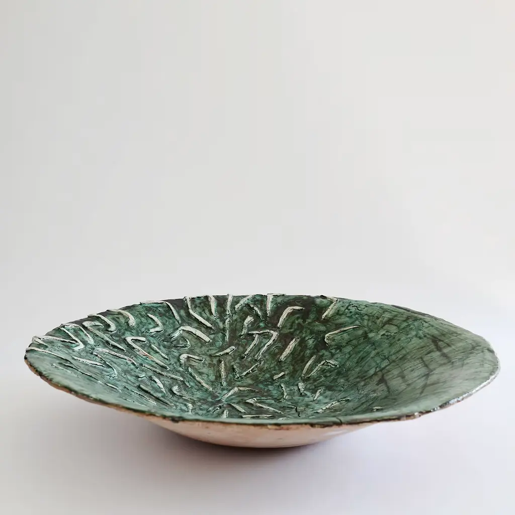 This striking round plate was hand made in terracotta using the coiling technique and then covered with rich glazes and oxides in shades of green. Due to its hand-crafted nature, reproductions of this piece will be similar but not identical.