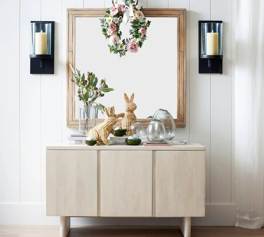 An iconic Easter character, this cotton-tailed duo brings a whisper of whimsical to the spring home. Strands of wicker are expertly handwoven around an iron base, bringing each playful pose to life. Whether placed together or apart, they add a charming element to a side table or mantle.