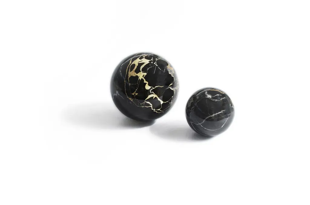 Paperweight with sphere shape in Portoro marble. Measure: Diameter 8 cmEach piece is in a way unique (since each marble block is different in veins and shades) and handcrafted in Italy. Slight variations in shape, color and size are to be considered a guarantee of a handcrafted creation. This object gives a distinct touch to your house and studio desk and can be an elegant gift.
