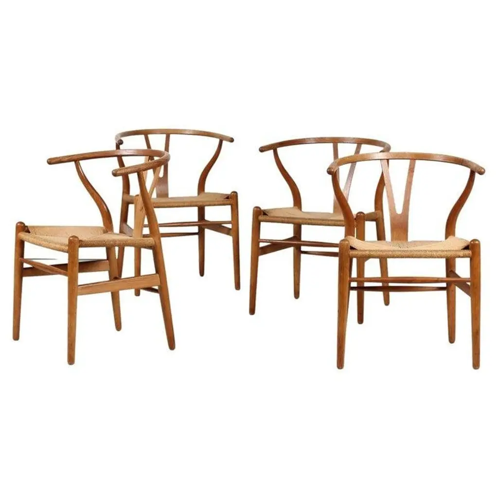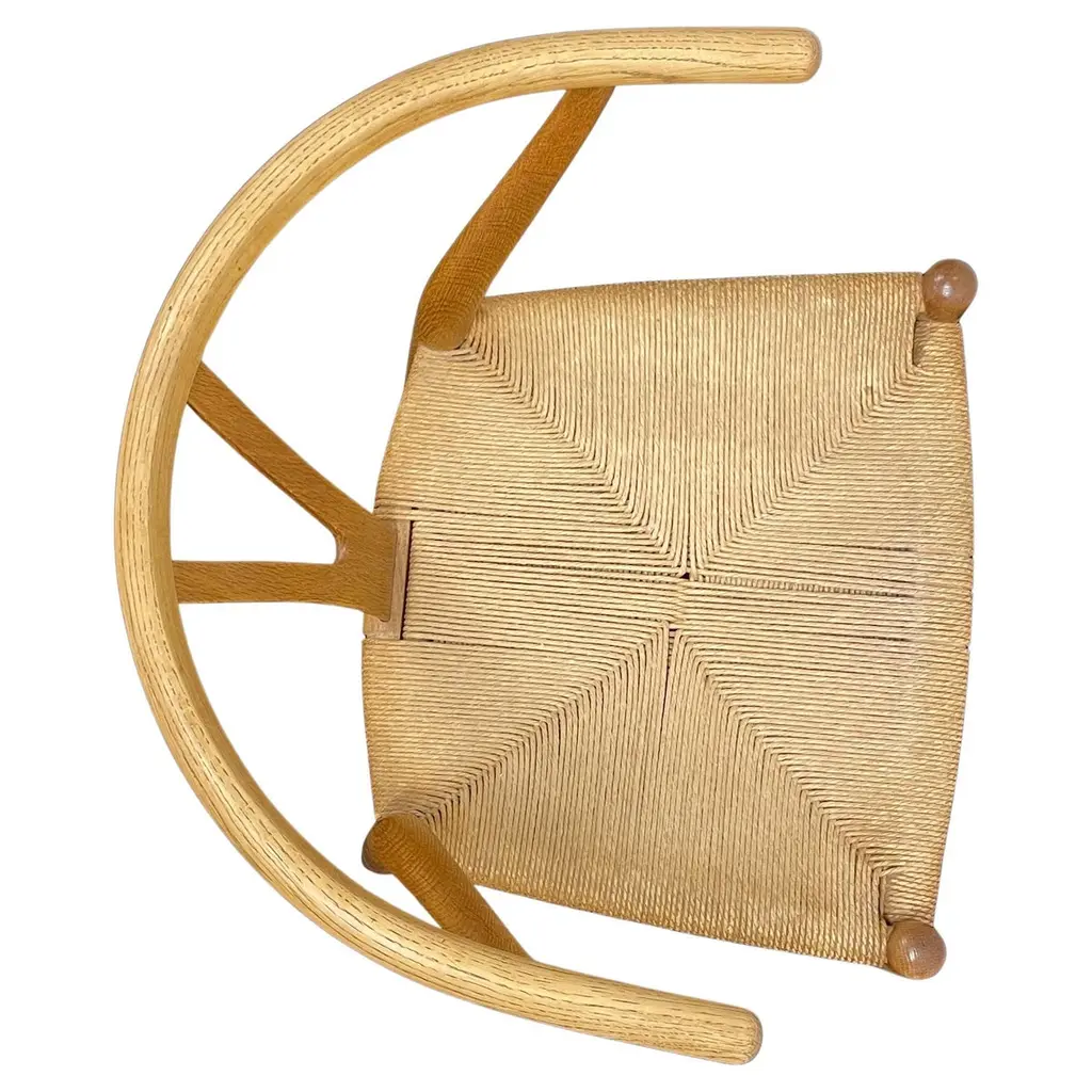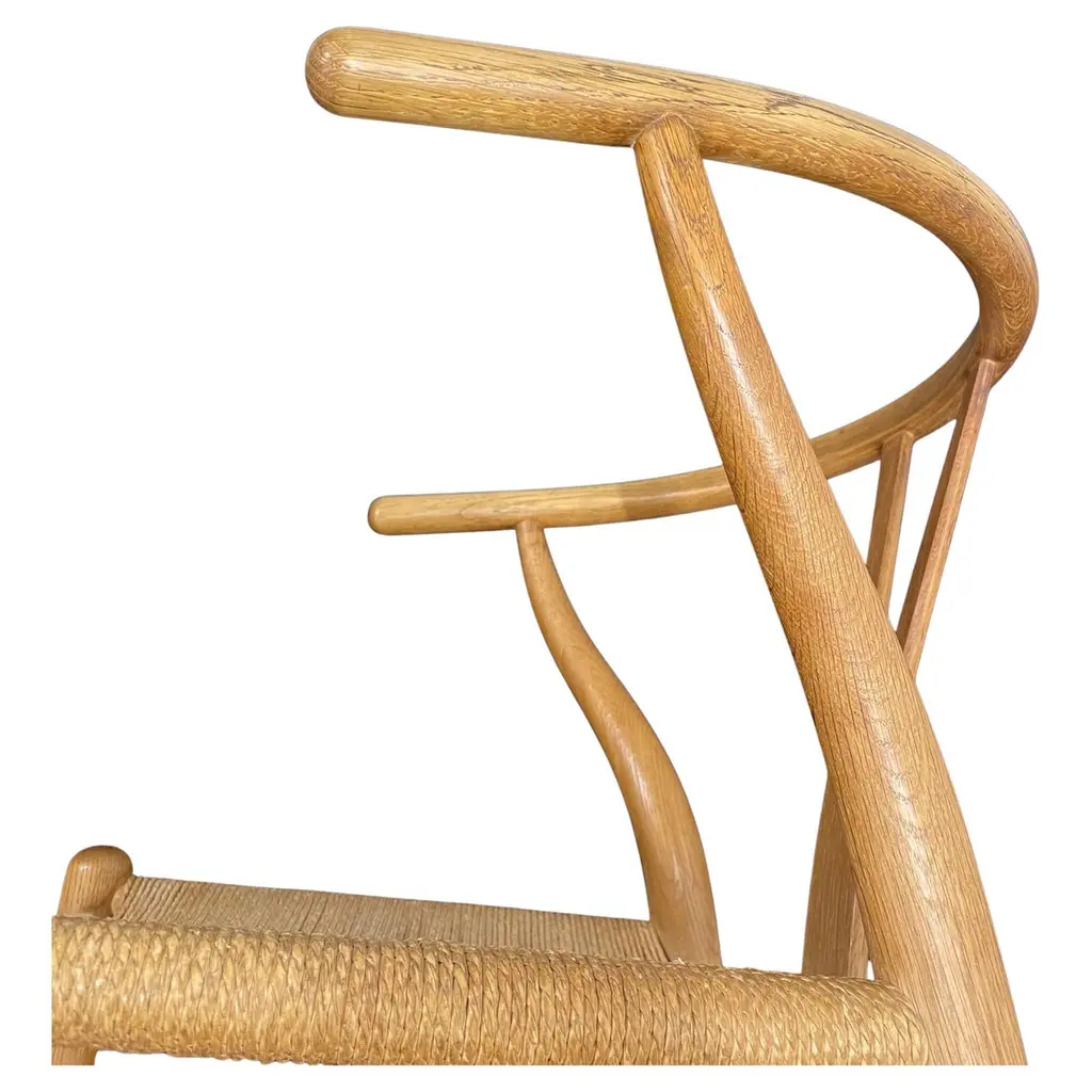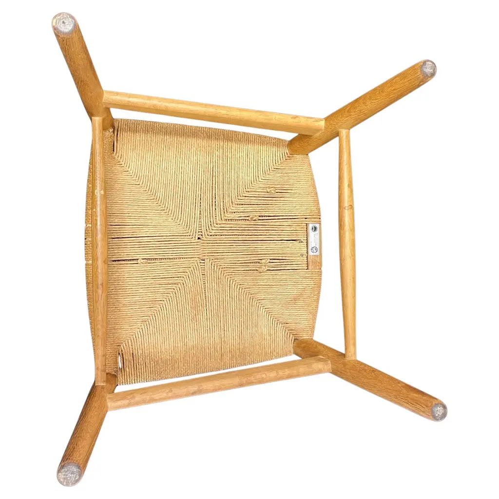 Hans Wegner Wishbone CH24 for Carl Hansen in oak and Danish rope, designed by Hans Wegner in 1950 and this produced in 1973, so when the craftmanship was still mainly manual. This iconic model also known as the "Wishbone chair" has been recognized by many professionals as the perfect chair. The price is for 1 but we have a set of 6, dated 1972/73, in perfect condition with a very nice patina on the oak and good original rope. This simple, elegant and functional design has a shape that perfectly matches the sitting posture of the human body and the curved backrest is an important element. Hans Wegner, the great Danish designer of Scandinavian Modernist Design, placed great importance on the functionalism of his pieces and throughout his career and life sought to create the perfect chair. This quest for the perfect chair resulted in more than 500 chair designs, but more importantly the designer left behind a selection of equally timeless and comfortable models, of which the Wishbone chair is one.Out of the 6 chairs, one has been re-corded with new Danish cord, while the other five still have their original cord.
