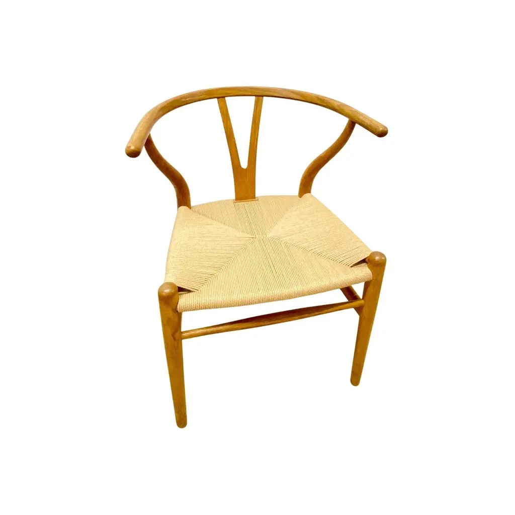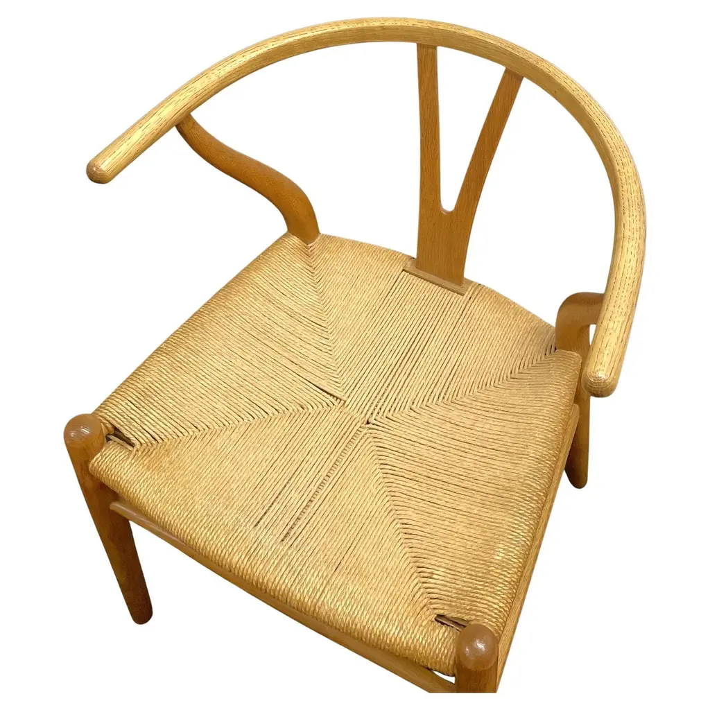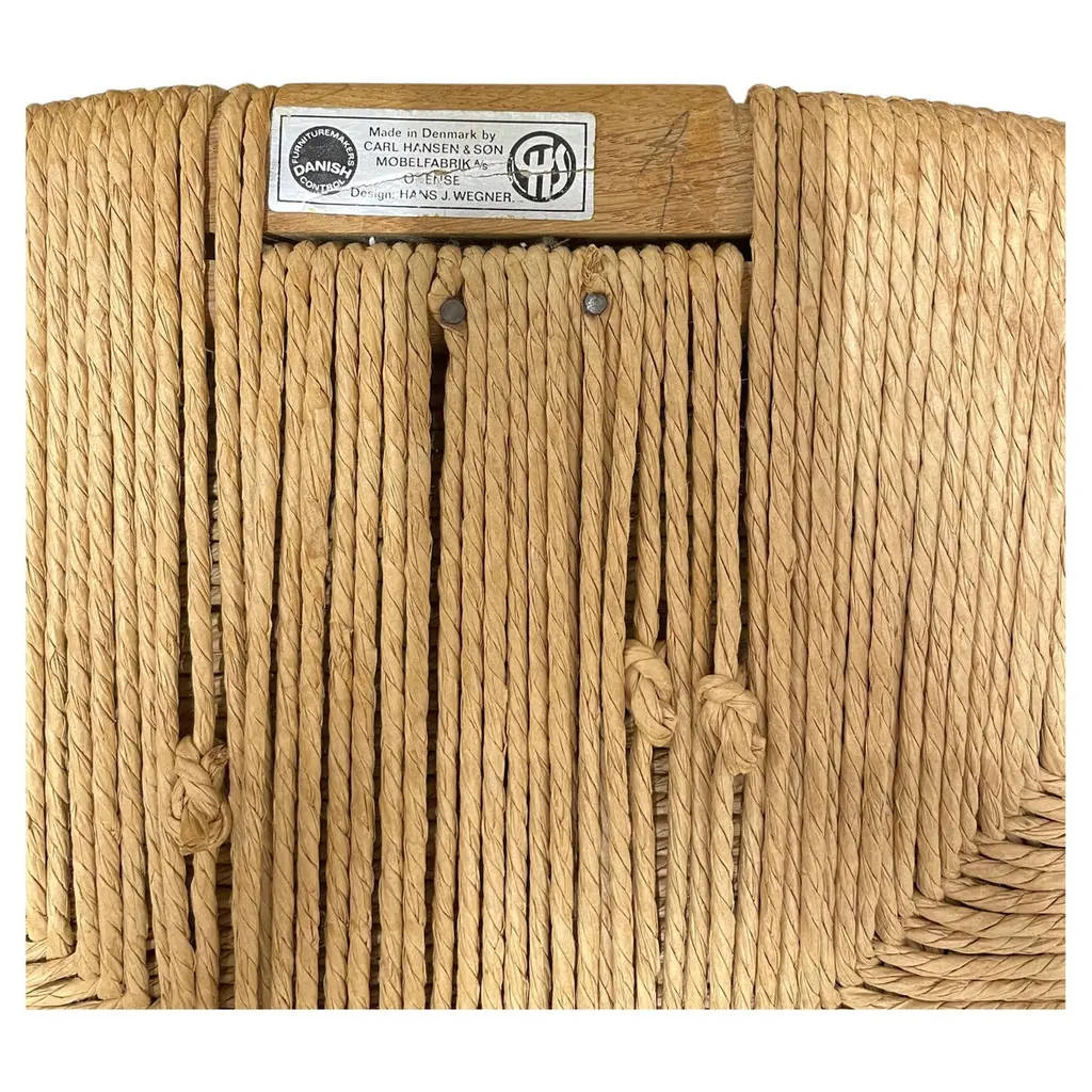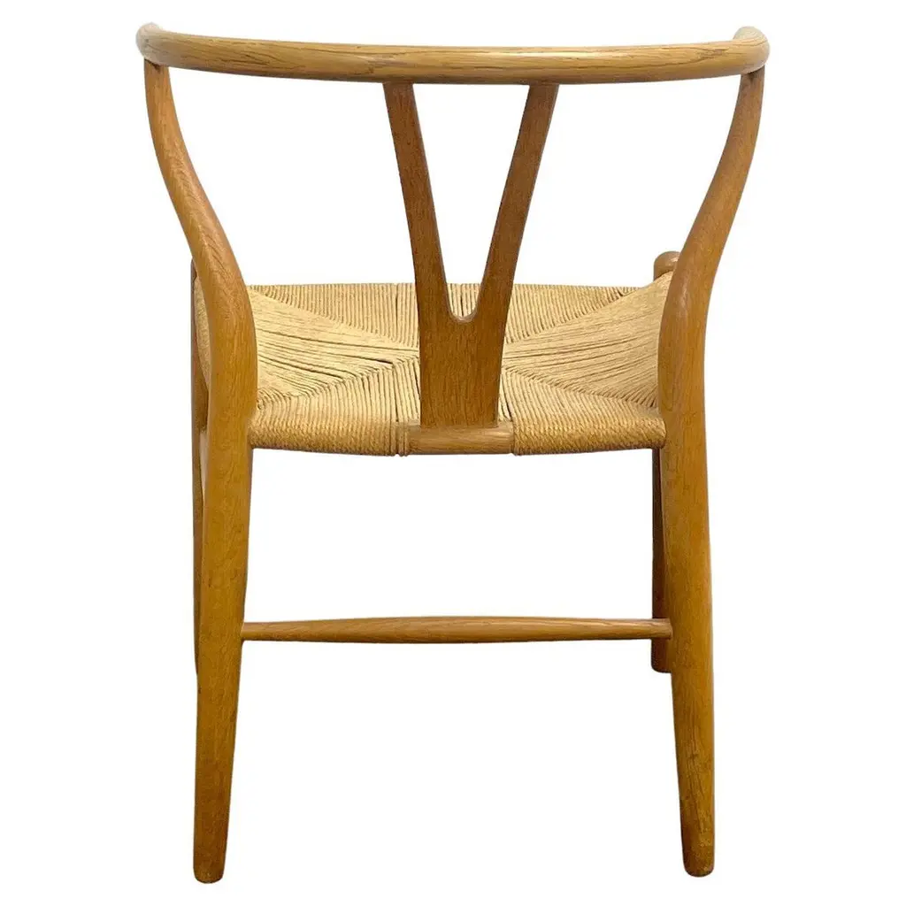 Hans Wegner Wishbone CH24 for Carl Hansen in oak and Danish rope, designed by Hans Wegner in 1950 and this produced in 1973, so when the craftmanship was still mainly manual. This iconic model also known as the "Wishbone chair" has been recognized by many professionals as the perfect chair. The price is for 1 but we have a set of 6, dated 1972/73, in perfect condition with a very nice patina on the oak and good original rope. This simple, elegant and functional design has a shape that perfectly matches the sitting posture of the human body and the curved backrest is an important element. Hans Wegner, the great Danish designer of Scandinavian Modernist Design, placed great importance on the functionalism of his pieces and throughout his career and life sought to create the perfect chair. This quest for the perfect chair resulted in more than 500 chair designs, but more importantly the designer left behind a selection of equally timeless and comfortable models, of which the Wishbone chair is one.Out of the 6 chairs, one has been re-corded with new Danish cord, while the other five still have their original cord.