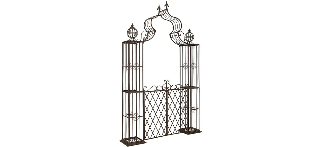Fanciful as a Victorian romance novel, this intricately detailed outdoor Jolin arbor is a four season stunner. Jolin's classic lines in rustic brown iron add strikingly elaborate architecture to the garden, providing a frame for sprawling vines and scented blossoms.