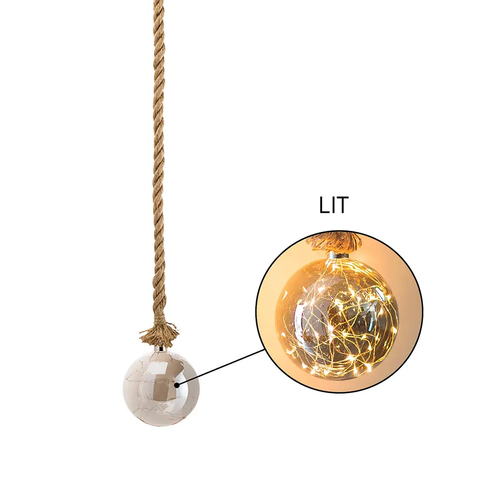 Add a warm and whimsical glow to any space with our Hanging Glass Globe Light with Rope. This beautiful orb features a clear glass finish that showcases a string of warm white micro LED lights inside, creating a cozy sparkle that instantly elevates your décor. Suspended by a rustic rope with a decorative knot, it blends industrial charm with farmhouse elegance. Perfect for hanging in entryways, porches, patios, or as a year-round accent indoors, this versatile light makes a stunning statement wherever it shines.