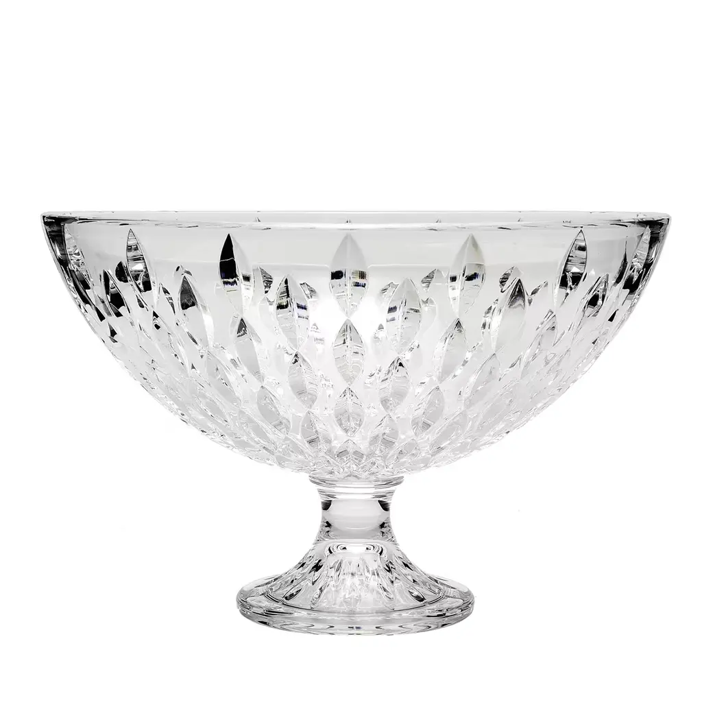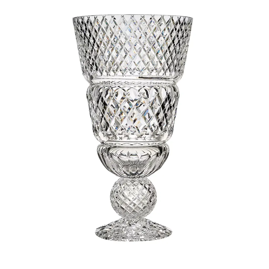 Vases of imposing size carried by a base and a sphere that can be clear or amber to bring a touch of color. Crossing hand-cut on the surface creates very suggestive light effects. Handcraftsmanship and design become one to give life to a collection thought to bring suggestive decorations effect and unique sensations. Completely mouth-blown and hand-cut in pure lead crystal.