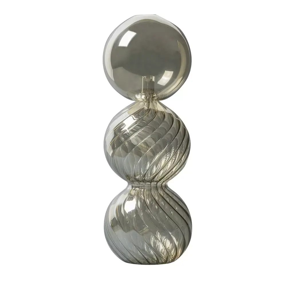 Elementi Lagunari were among the first well-known collections by Luciano Gaspari for Salviati, and are a perfect example of the aesthetics of the 1950s. These abstract and evocative elements hint at the dolphin structures in the Venetian Lagoon. They are made of grey or pink solid glass and have a thin white or teal internal thread that rises from the base along the vertical axis of the element, becoming thinner towards the top. The compact spherical shapes at the top are heat bonded to the tapered body. The difficulty in this piece is to maintain the verticality of the element, preventing any geometric distortion.