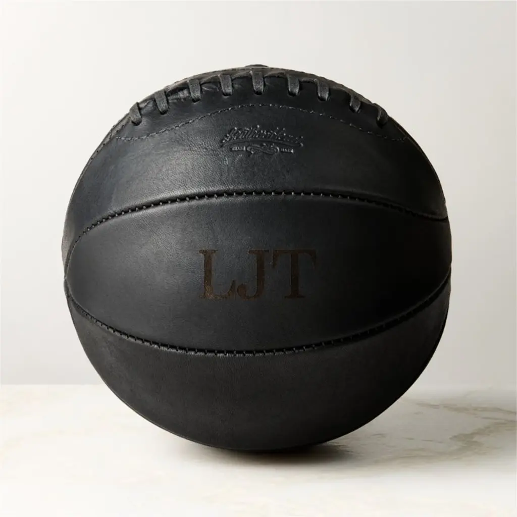 Crafted of genuine black leather, scaled-down basketball plays out legacy vibes in game and on display. Stitched seams, rawhide lacing and a rubber bladder made to last. Designed by Leather Head Sports, New Jersey-based makers of heirloom-quality sporting goods. Plays perfectly with our white leather hoop.