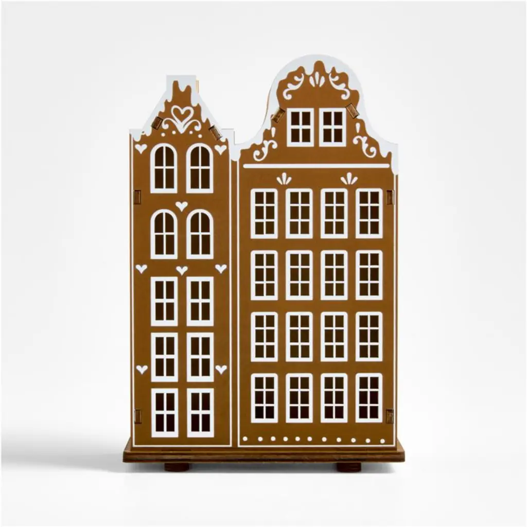 Inspired by traditional Bavarian architecture, our gingerbread buildings charm with faux frosting details and fanciful roofs laden with sugar-like snow. The hand-assembled wooden village conceals LED lights that glow warmly through the laser-cut windows. We especially love the look of these homes lined up in a sparkling cityscape on your fireplace mantel, entryway console or bookshelf.