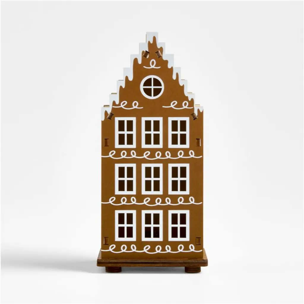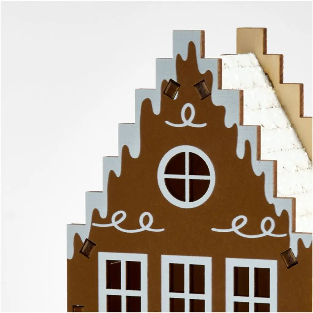 Inspired by traditional Bavarian architecture, our gingerbread buildings charm with faux frosting details and fanciful roofs laden with sugar-like snow. The hand-assembled wooden village conceals LED lights that glow warmly through the laser-cut windows. We especially love the look of these homes lined up in a sparkling cityscape on your fireplace mantel, entryway console or bookshelf.