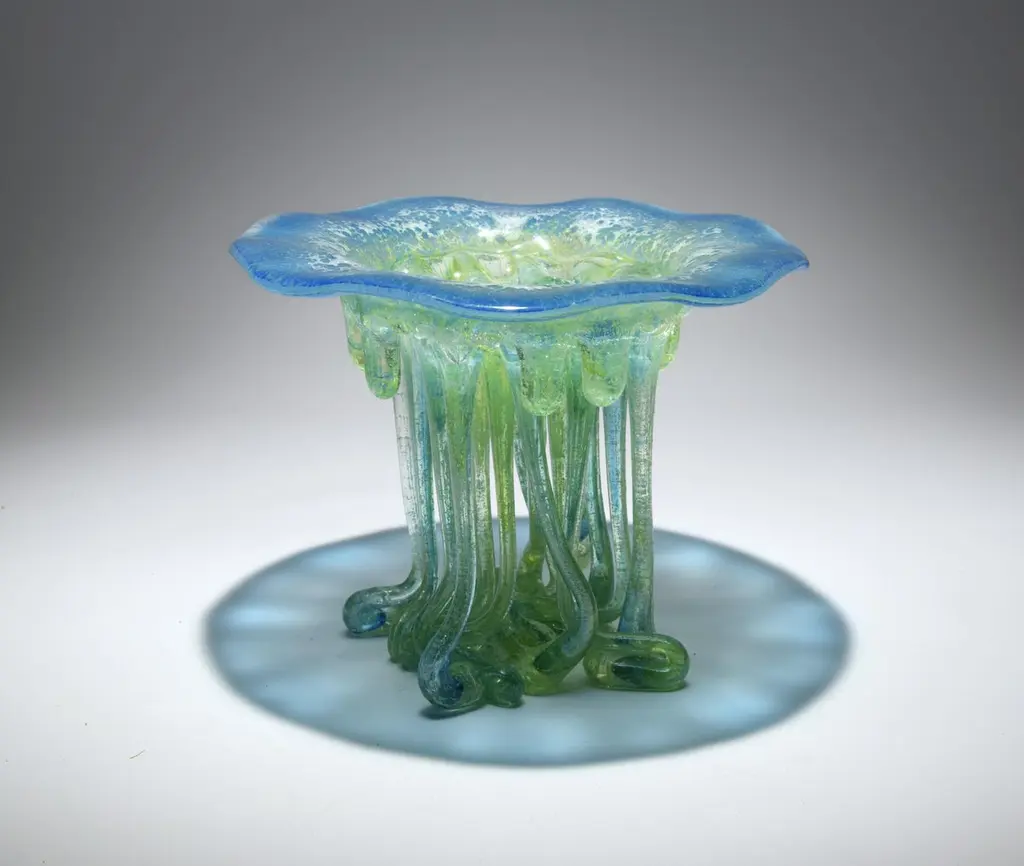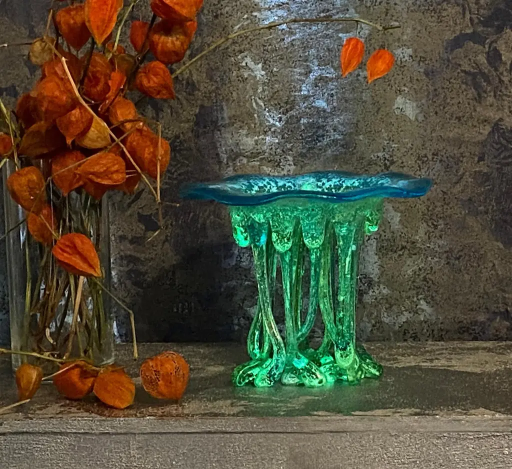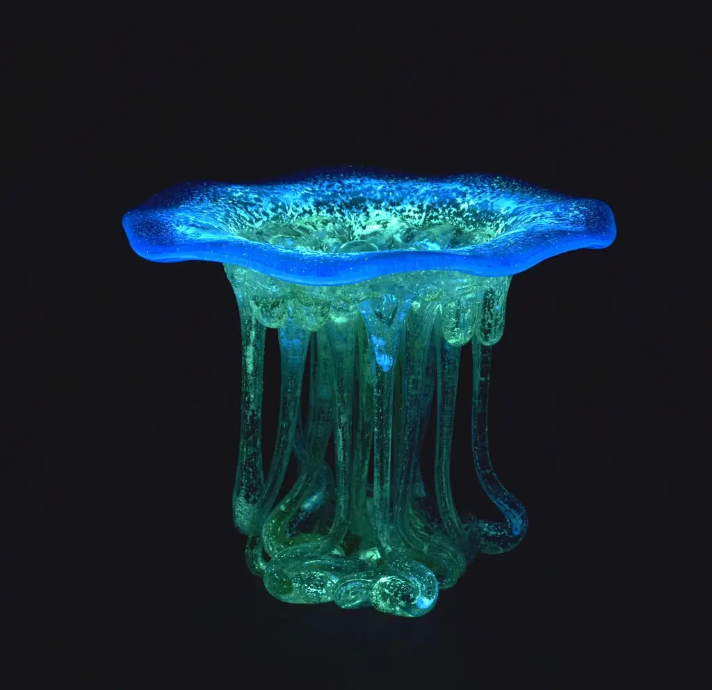 The jellyfish is the main element of the Mosche Bianche's "Medusa" Collection: fluid, delicate but also dangerous and deadly. It represents the water, the circle of life. The special pigments in this creation make it flourescent. The fluorescence is the property that allows an object to absorb the light, such as sunlight or artificial light from environment and to accumulate it. Into the dark that object slowly releases the stored light, self illuminating for many hours, creating a suggestive effect. Glass fusing basically means building a new solid-state glass, assembling different pieces that, in contact with heat, varying from 800 ° C to 850 ° C, become so fluid that they join together deeply and irreversibly.The cooling is very slow in order to allow the total reorganization and recovery of the molecular stability that the material possessedbefore being heated. Glass fusing allows, using colored compounds (enamels, oxides) to produce polychromeobjects.The work of the artist uses two main tools: heat and the force of gravity. The result depends on the degree of communication between the artist, the glass and the oven he uses.Size: cm 37 x 37 x 21 (inch.14.57 x 14.57 x 8.26)This handmade masterpiece is a unique piece, made in Italy.
