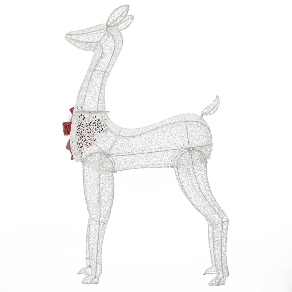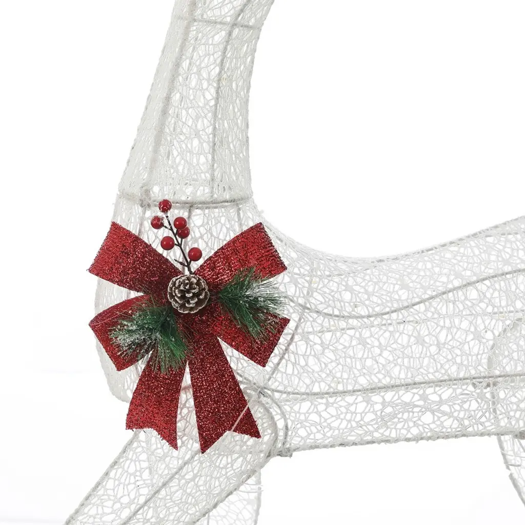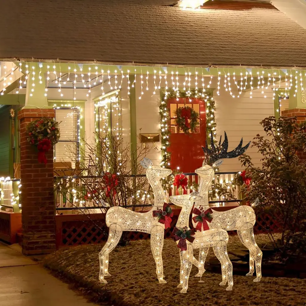 Transform your outdoor space into a festive wonderland with this charming lighted deer family set! This display is perfect for spreading holiday cheer to your family, friends, and neighbors. Each deer features a robust metal frame wrapped in durable polyester, accented with a decorative red bow, a pinecone, and greenery that add to its festive charm. With 380 warm white lights pre-installed, this enchanting set will illuminate your yard beautifully, creating a magical atmosphere for the holiday season. The arrangement is both practical and flexible, powered by a single plug and accompanied by a 9.8-foot cord. You can also arrange the deer up to 8 feet apart, allowing you to customize the display to fit your space perfectly. Embrace the spirit of Christmas and elevate your outdoor decor with this delightful addition!