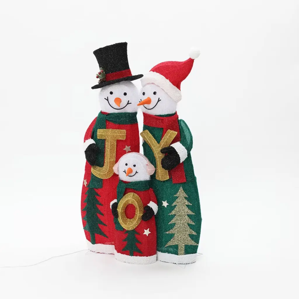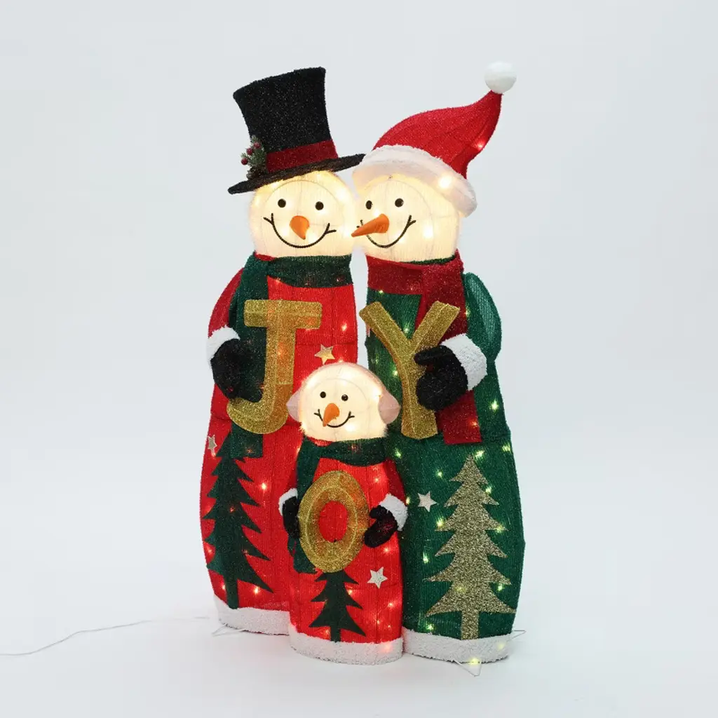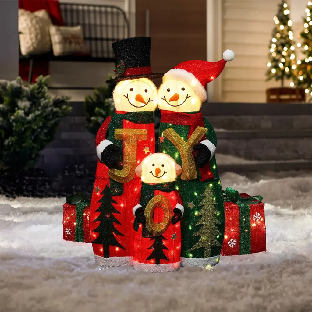 Embrace the spirit of the season with this charming 39.4-inch Snowman Family JOY decoration! This delightful trio features Papa donned in a classic top hat, Mama sporting a festive Santa hat, and their playful little snowman, all dressed in vibrant red-and-green outfits that exude holiday cheer. Accented with glowing "JOY" that radiates warmth, this enchanting display is beautifully illuminated by 130 warm white LED lights, setting the perfect atmosphere for your living room, porch, or garden. Create magical moments ideal for family photos, cozy evenings, or warmly welcoming guests. Designed for both indoor and outdoor use, this durable decoration adds a whimsical touch to your festive celebrations.