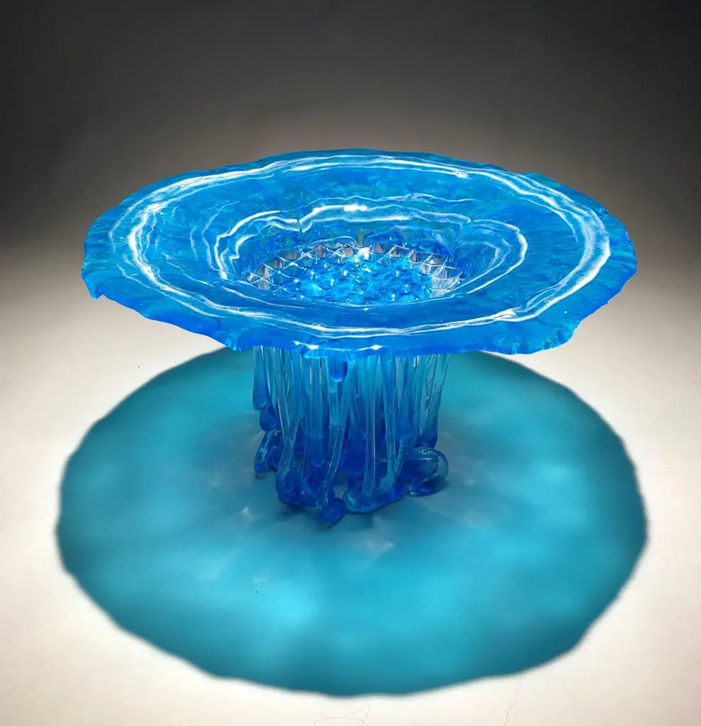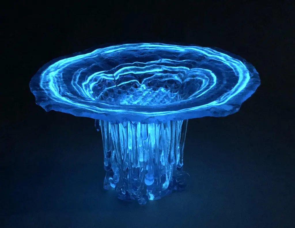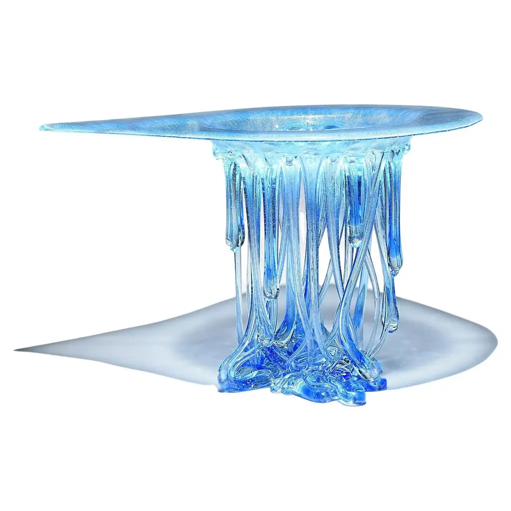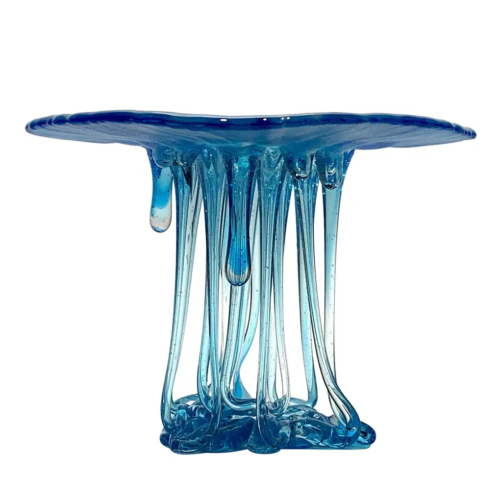The jellyfish is the main element of the Mosche Bianche's "Medusa" Collection: fluid, delicate but also dangerous and deadly. It represents the water, the circle of life. The special pigments in this creation make it flourescent. The fluorescence is the property that allows an object to absorb the light, such as sunlight or artificial light from environment and to accumulate it. Into the dark that object slowly releases the stored light, self illuminating for many hours, creating a suggestive effect. Glass fusing basically means building a new solid-state glass, assembling different pieces that, in contact with heat, varying from 800 ° C to 850 ° C, become so fluid that they join together deeply and irreversibly.The cooling is very slow in order to allow the total reorganization and recovery of the molecular stability that the material possessedbefore being heated. Glass fusing allows, using colored compounds (enamels, oxides) to produce polychromeobjects.The work of the artist uses two main tools: heat and the force of gravity. The result depends on the degree of communication between the artist, the glass and the oven he uses.Size: cm 41 x 41 x 23 (inch.16.14 x 16.14 x 9.05)This handmade masterpiece is a unique piece, made in Italy.