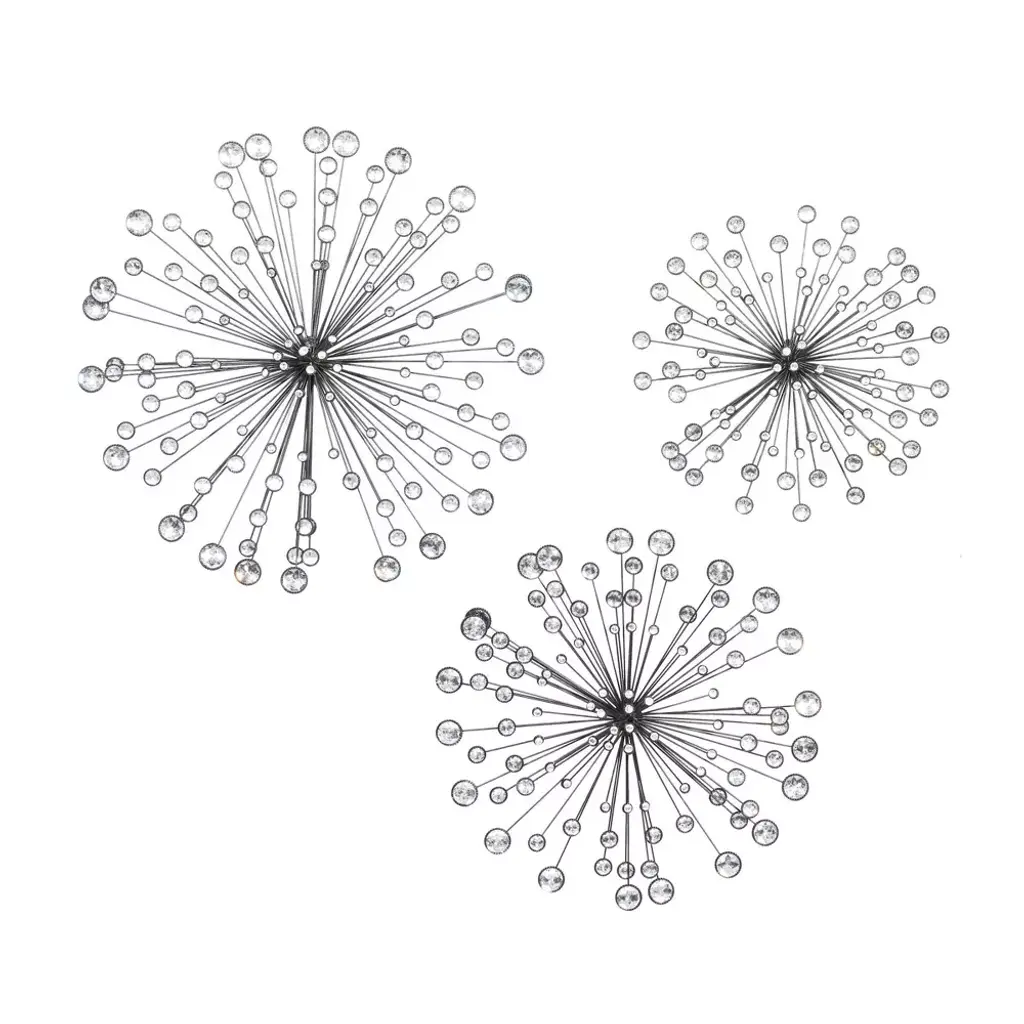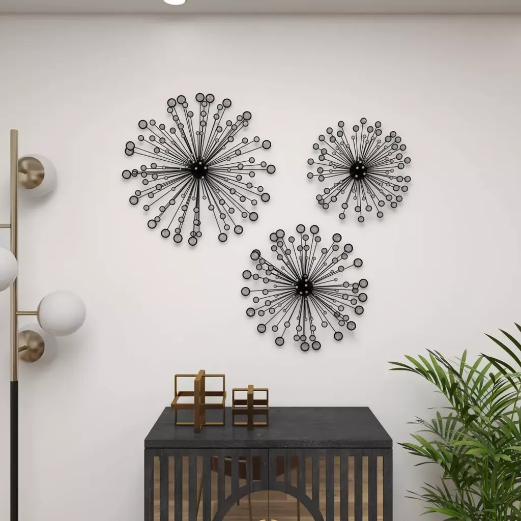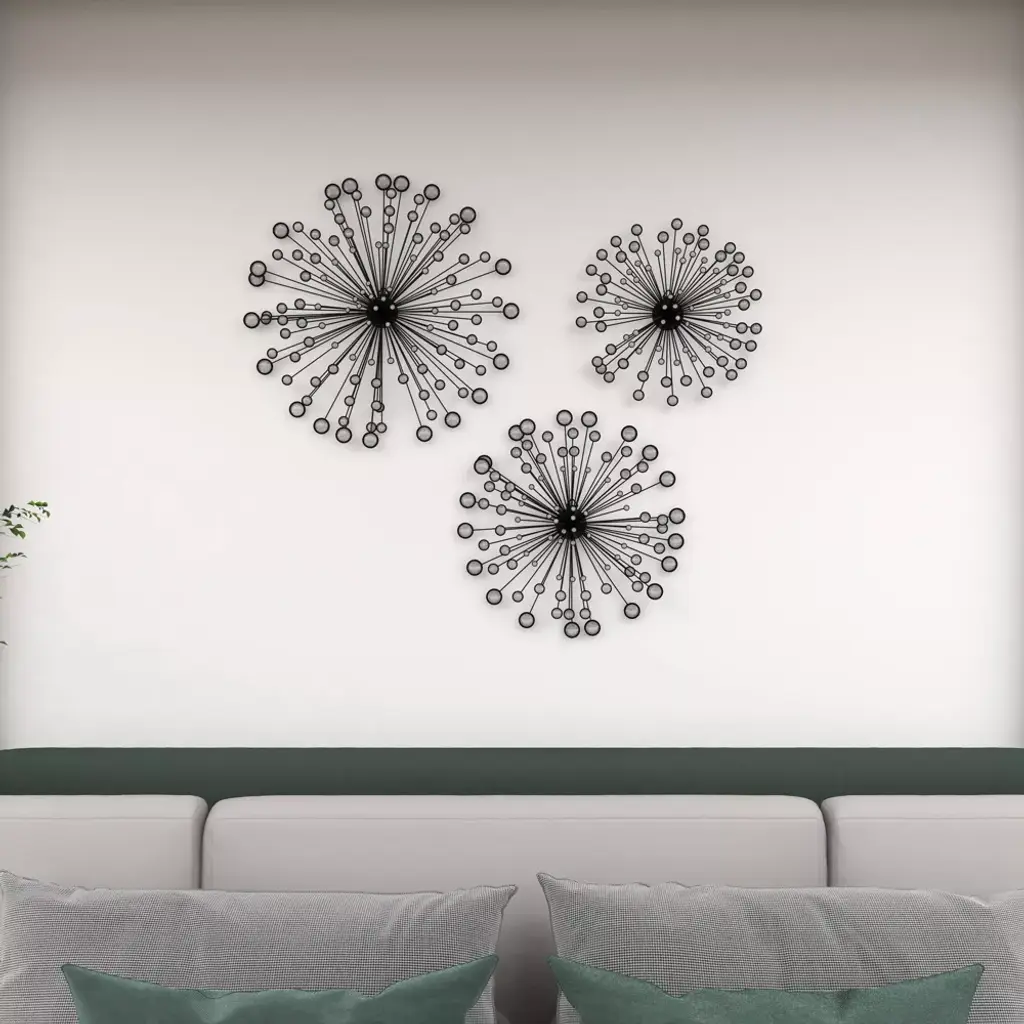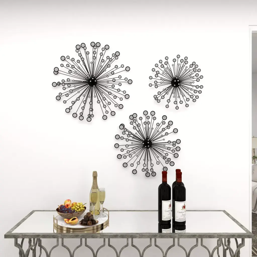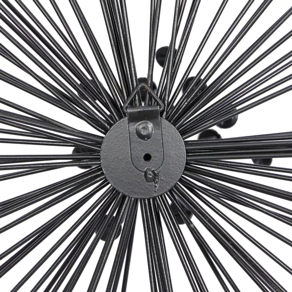 This starburst wall decor set of 3 are ideal as an accent wall pieces for the living room, the hallway, and the bedroom. This item ships in 1 carton. Features three various-sized starburst metal sculptures with a 'sea urchin' inspired design. Can be hung vertically using the keyholes on the back; nails and screws not included. Suitable for indoor use only. This item ships fully assembled in one piece. This black colored wall sculptures comes as a set of 3. Glam style.