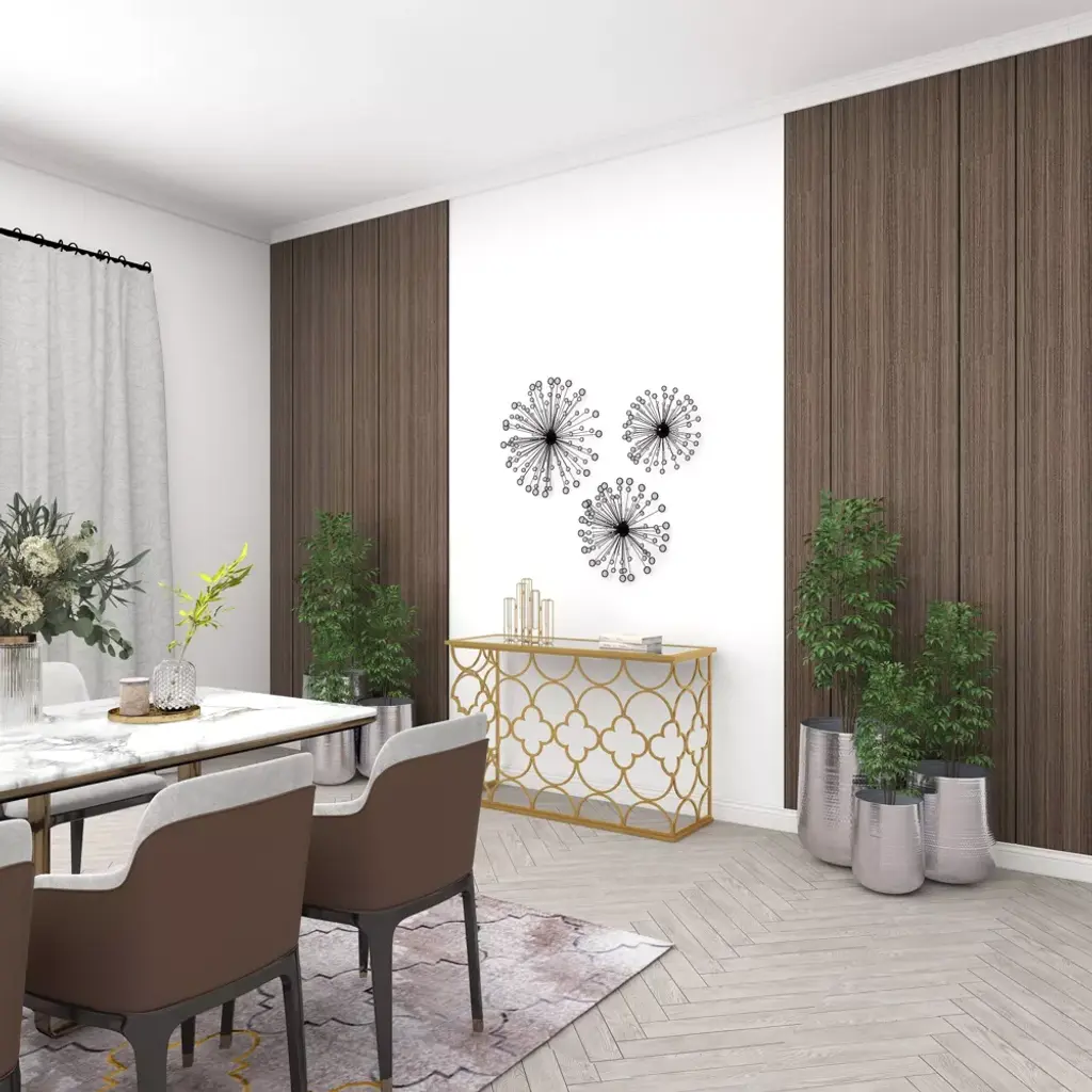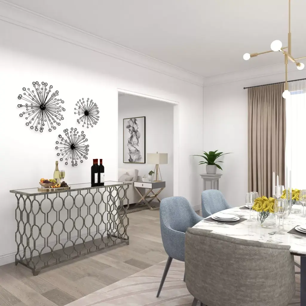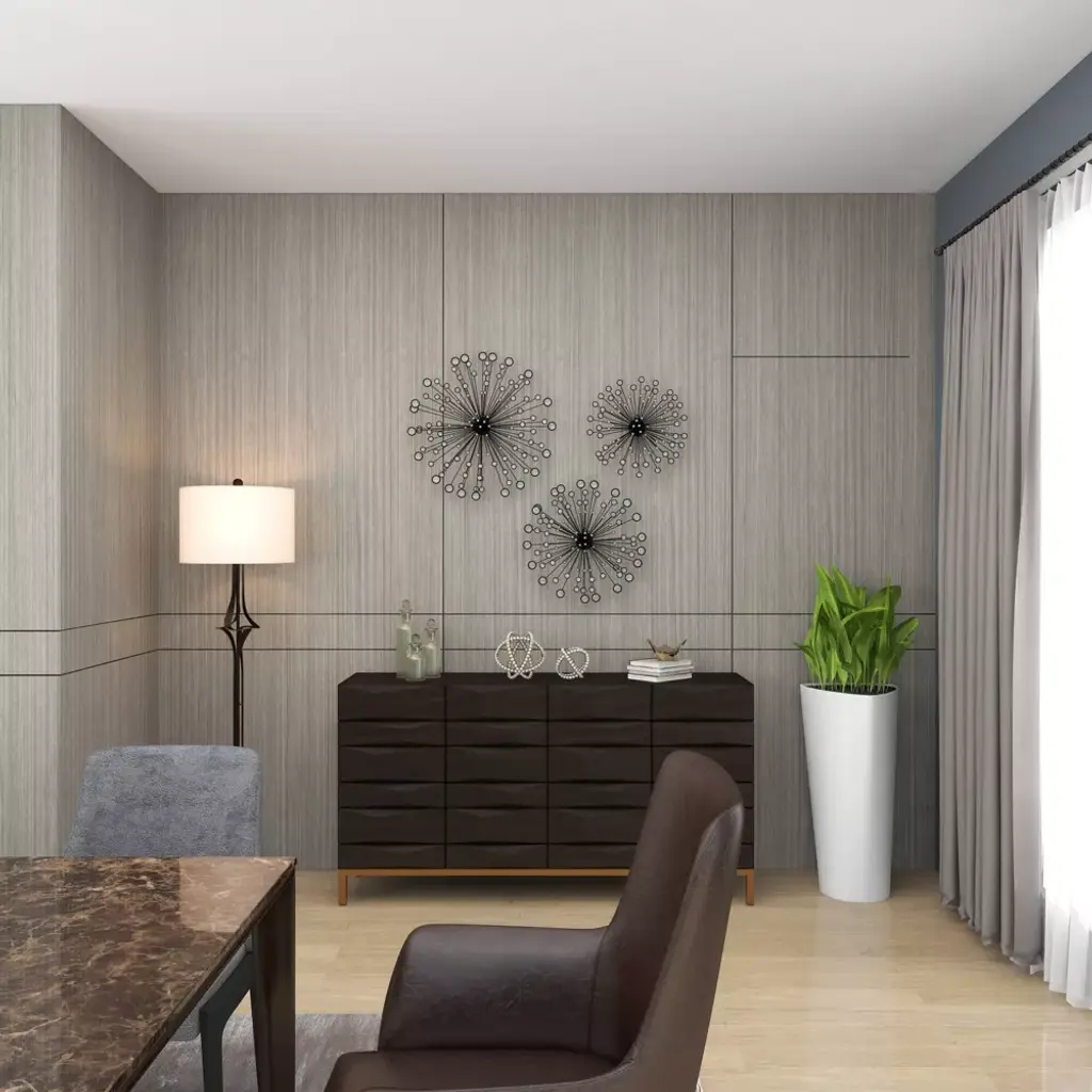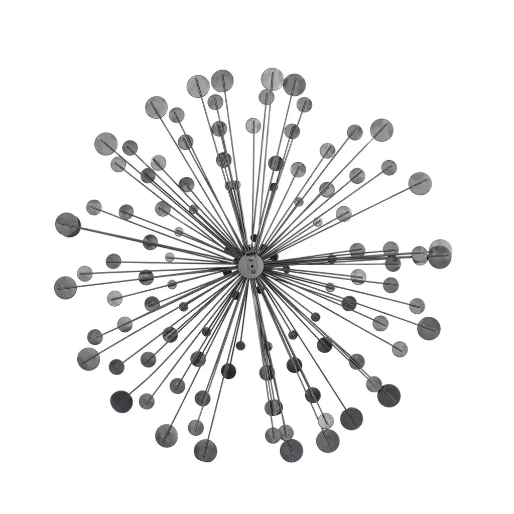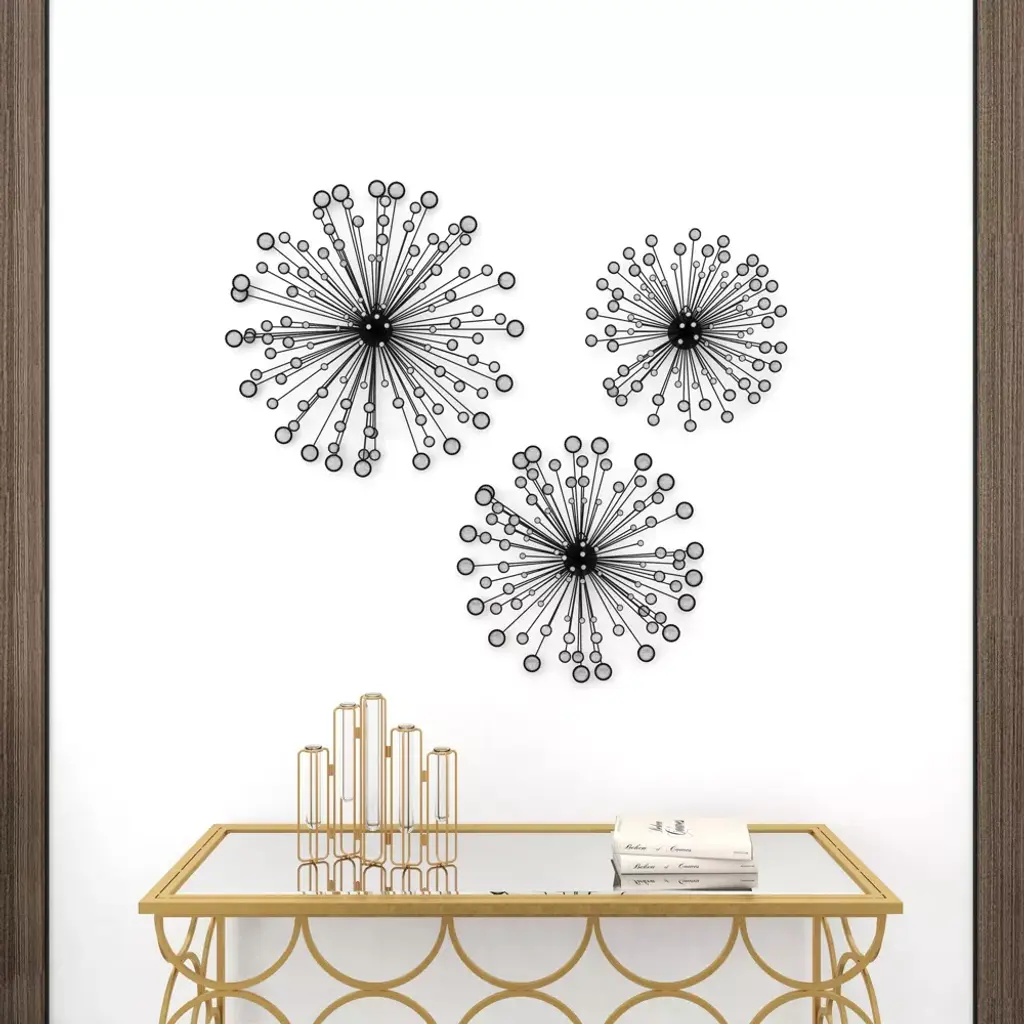 This starburst wall decor set of 3 are ideal as an accent wall pieces for the living room, the hallway, and the bedroom. This item ships in 1 carton. Features three various-sized starburst metal sculptures with a 'sea urchin' inspired design. Can be hung vertically using the keyholes on the back; nails and screws not included. Suitable for indoor use only. This item ships fully assembled in one piece. This black colored wall sculptures comes as a set of 3. Glam style.