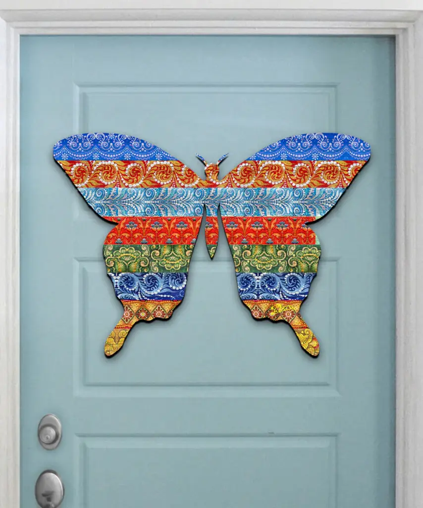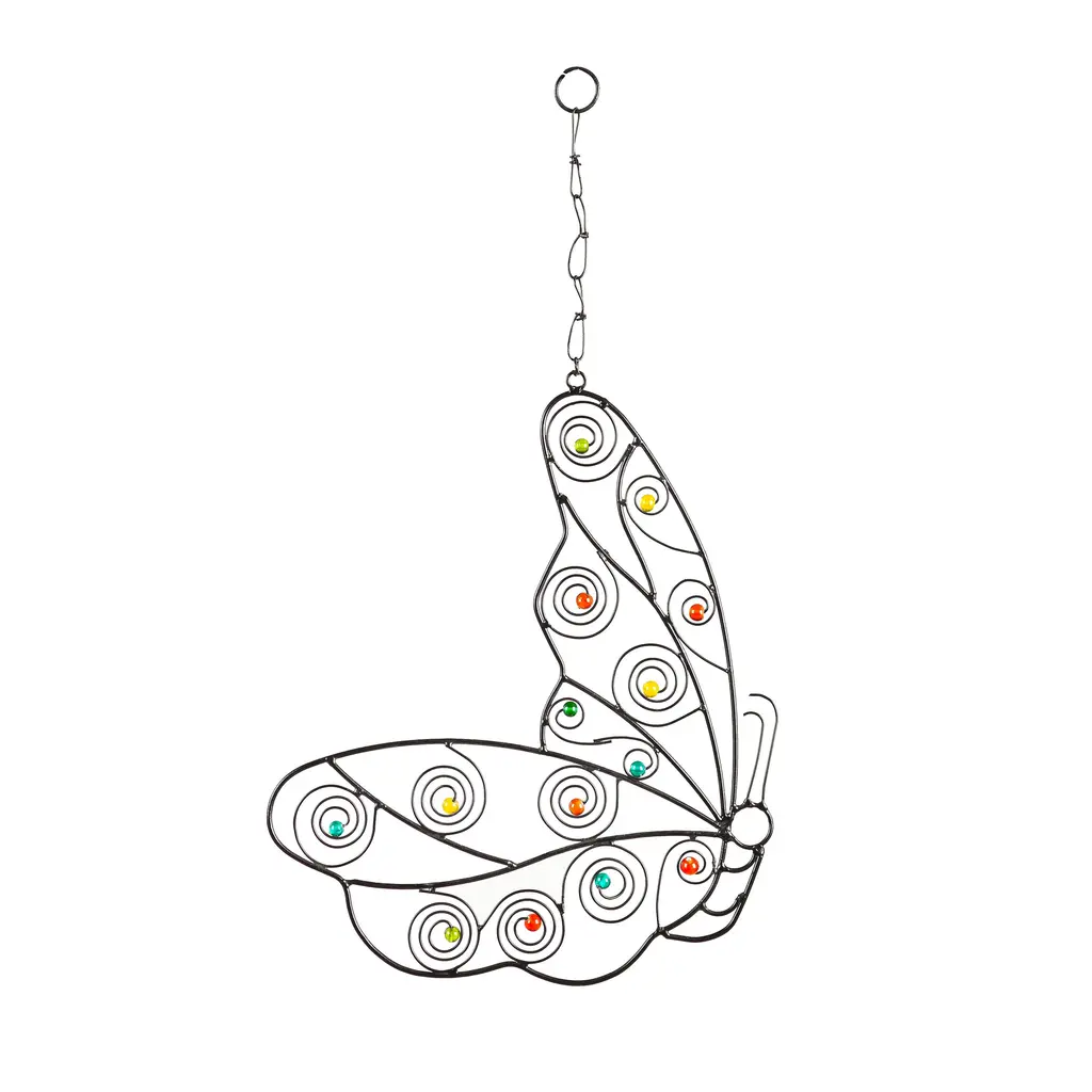 Add a whimsical accent to indoor and outdoor spaces with this enchanting set of 2 metal butterfly wall décor pieces. Artfully crafted of metal and embellished with colorful glass beads, these butterflies can be hung from a wall or keep them on the chain to dangle freely in the breeze. The high quality materials and superior construction ensures these designs are indoor and outdoor safe and won't rust or fade over time. Display the set separate or together for double the whimsy and charm.