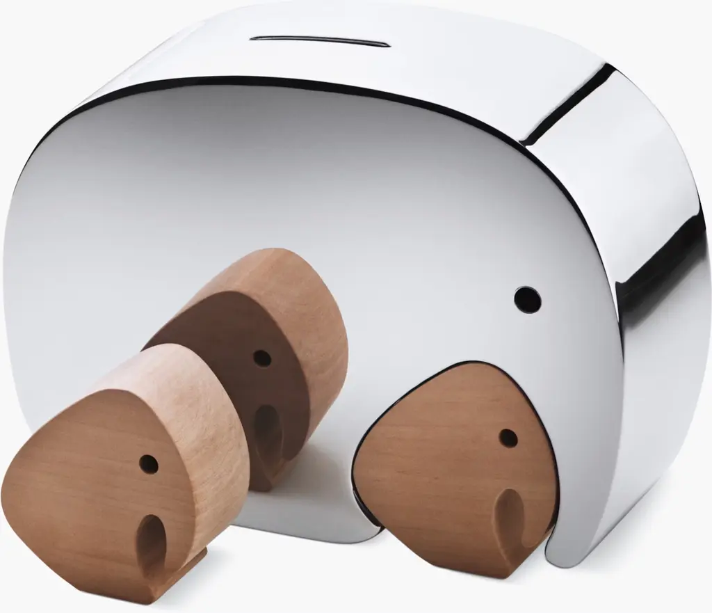 The joy and energy of an upbringing in Buenos Aires infuses all that Alfredo Häberli designs. His curiosity and personality bring a natural charm to his work and result in pieces that are as playful as they are beautiful. Inspired by Jensen's great-grandchild, Moneyphant (2011) is a clever piggybank features two small elephants - the twins - carved from solid oak that nest like jigsaw puzzle pieces within a large hollow elephant crafted from mirror-polished stainless steel. Made in China.