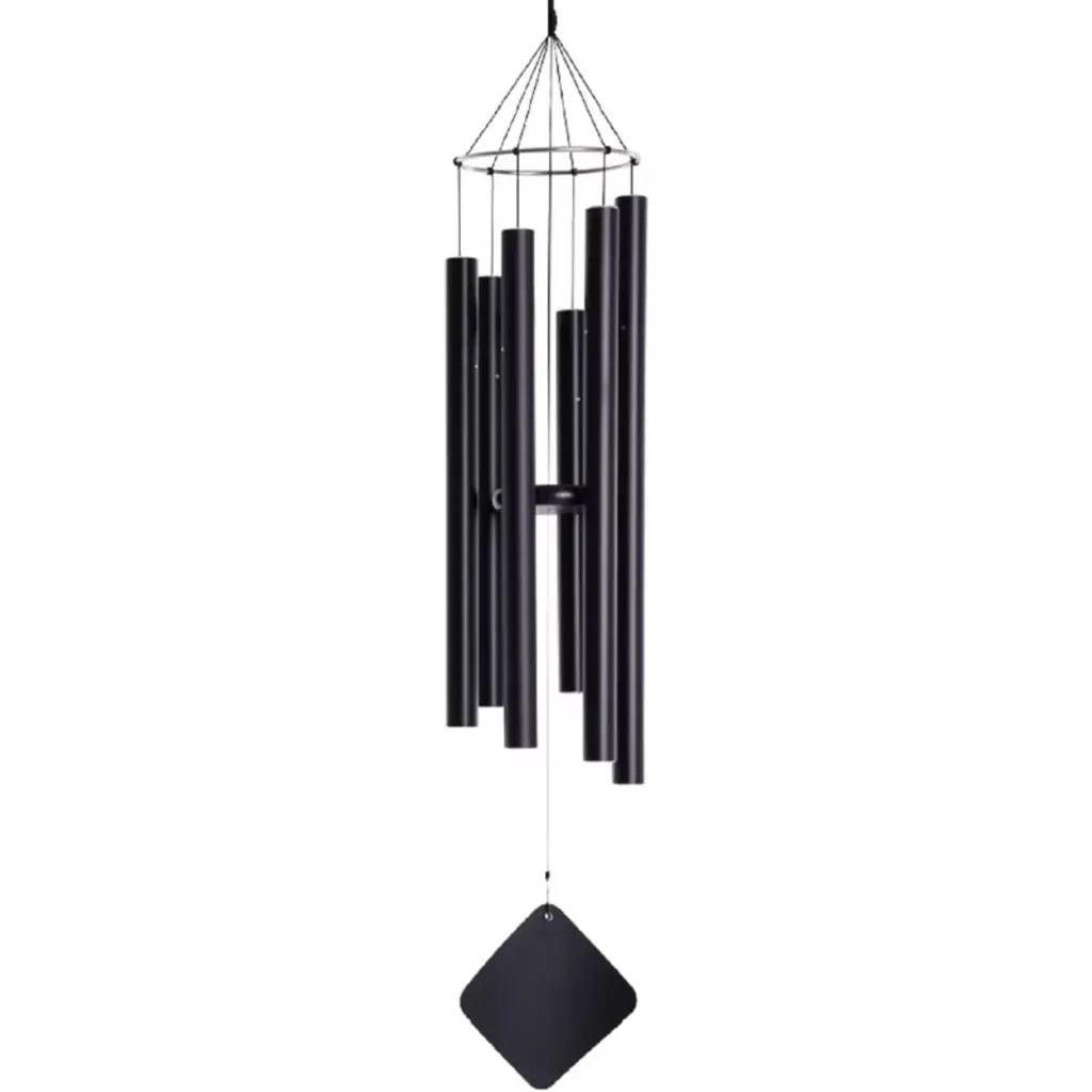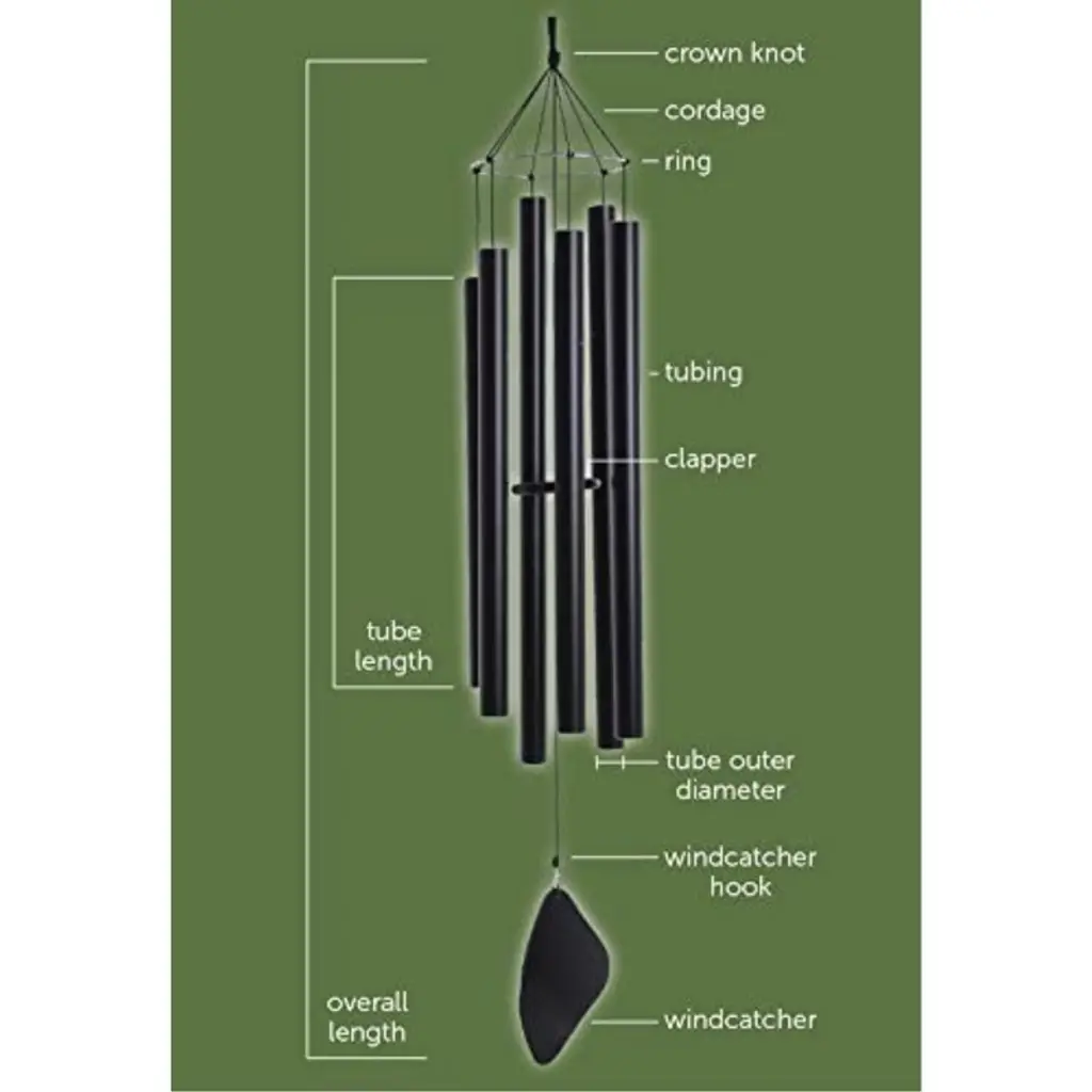 Heavy-gauge polished stainless-steel rings provide sturdy support and enduring beauty. UV stabilized synthetic braid cordage is highly resistant to abrasion, UV degradation, rot and mildew. Solid polyethylene clapper for superior tonal quality, designed to play in eight to ten mile per hour breezes. These chimes are meticulously hand crafted in the USA. Their elegant design features central tube suspension with smoothly polished tube ends to prevent cord abrasion. The tempered aluminum alloy tubing is custom manufactured and will never rust. The tubing is coated with a sleek black corrosion protective finish that provides durability in all kinds of outdoor environments. Heavy gauge polished stainless-steel rings provide sturdy support and enduring beauty. Their tough UV stabilized synthetic braid cordage is highly resistant to abrasion, ultra violet degradation, rot and mildew. Solid UV stabilized polyethylene clappers provide superior tonal quality and outdoor durability.