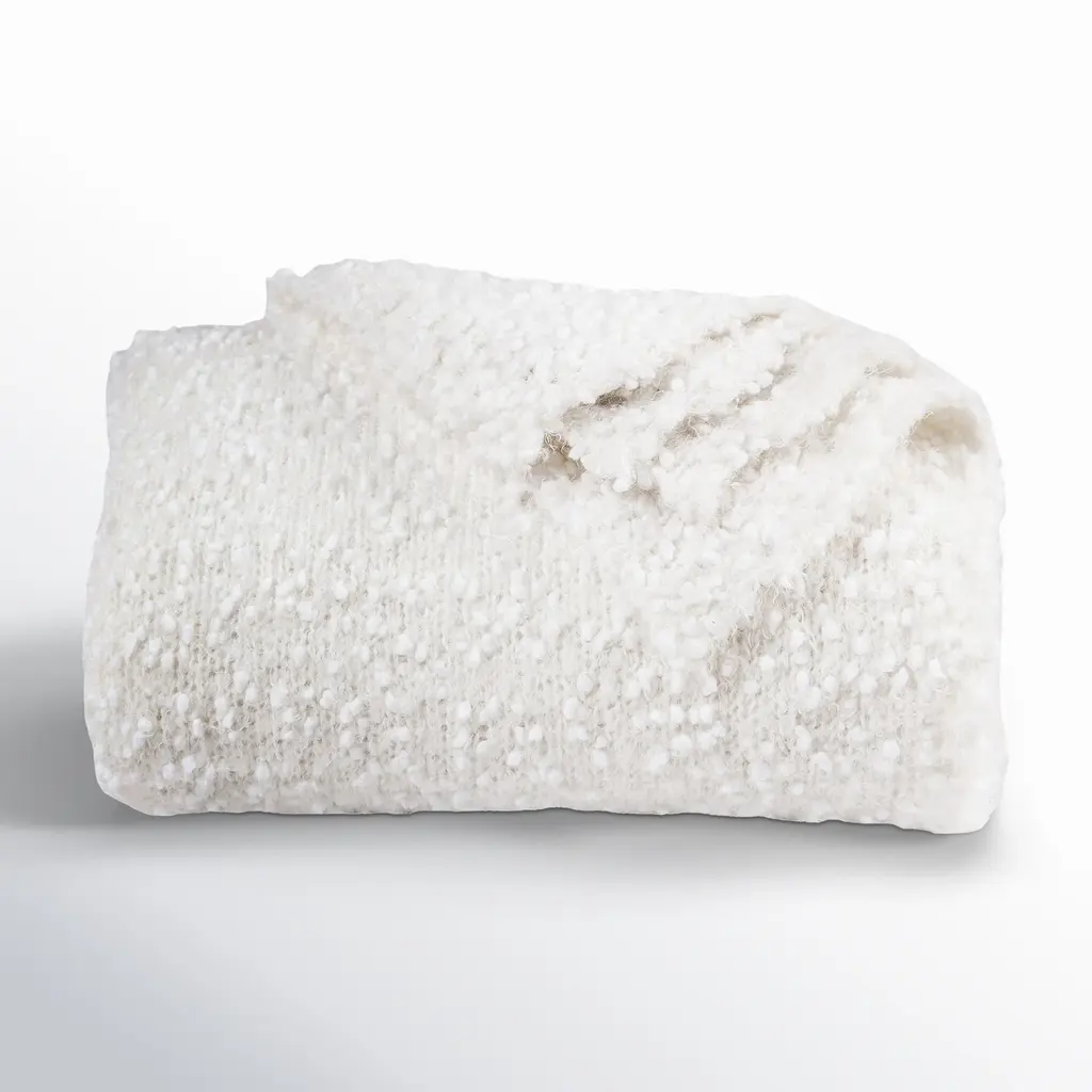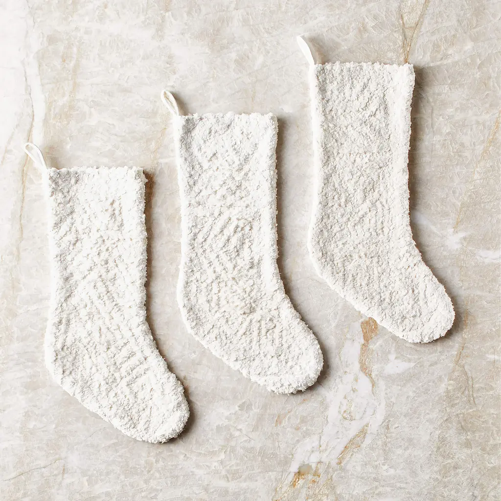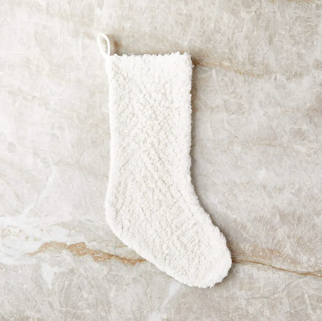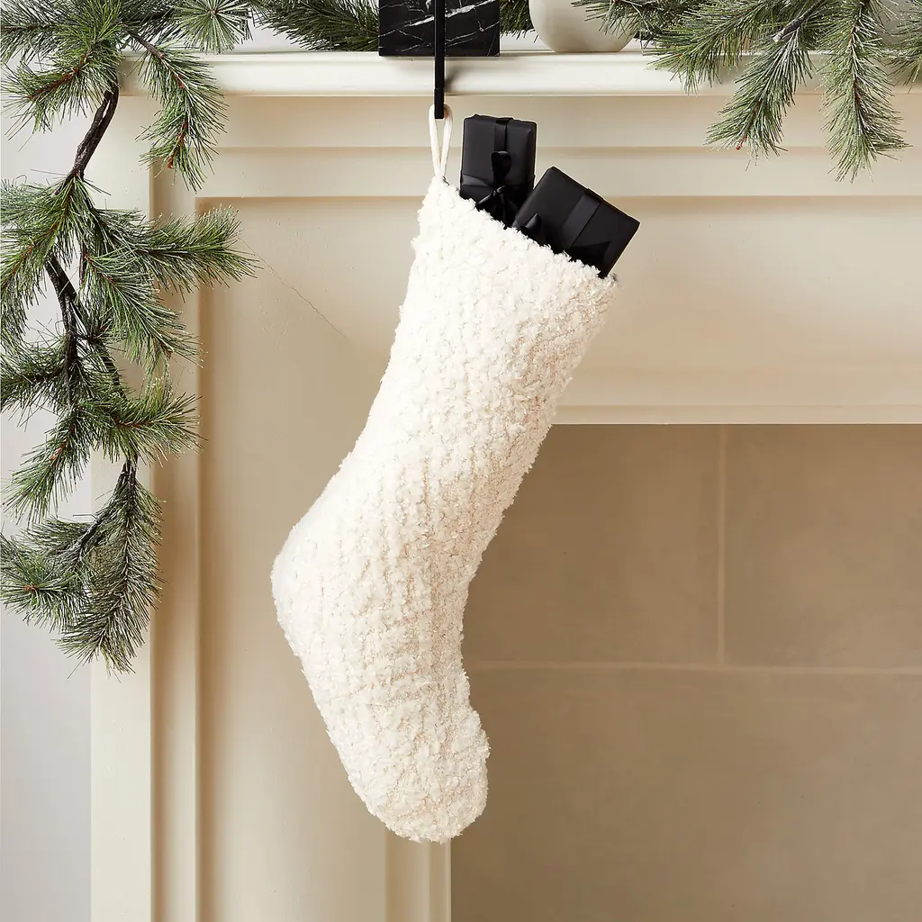 Stocking in ivory boucle features a subtle, vintage-inspired pattern that evokes holiday memories. CB2 exclusive.