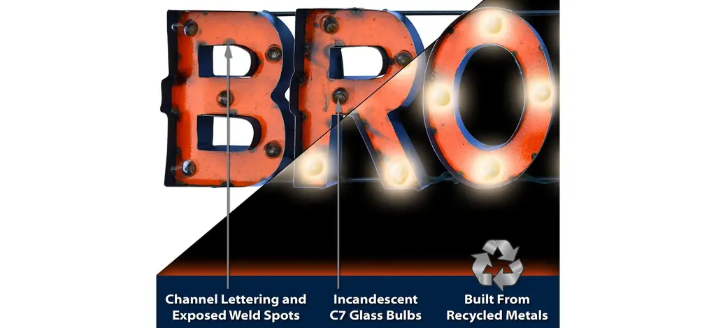 Light up your home or fancave with this NFL Sign. Suitable for indoor or outdoor use, this sign is built by hand from recycled metals and includes light strands with clear, incandescent C7 glass bulbs. An authentic style decor piece, the sign features channel logo and exposed weld spots that give a unique, retro look to any space.