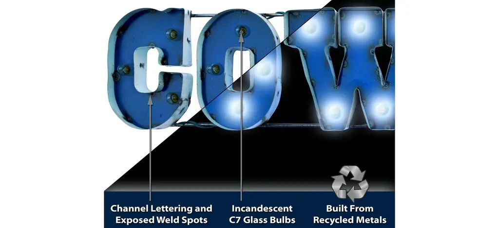 Light up your home or fancave with this NFL Sign. Suitable for indoor or outdoor use, this sign is built by hand from recycled metals and includes light strands with clear, incandescent C7 glass bulbs. An authentic style decor piece, the sign features channel logo and exposed weld spots that give a unique, retro look to any space.