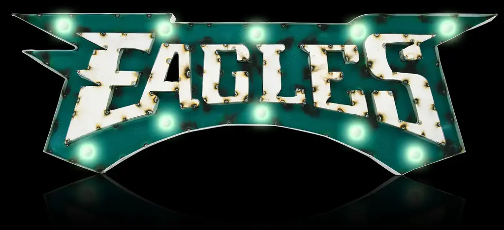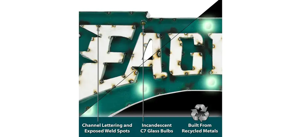 Light up your home or fancave with this NFL Sign. Suitable for indoor or outdoor use, this sign is built by hand from recycled metals and includes light strands with clear, incandescent C7 glass bulbs. An authentic style decor piece, the sign features channel logo and exposed weld spots that give a unique, retro look to any space.