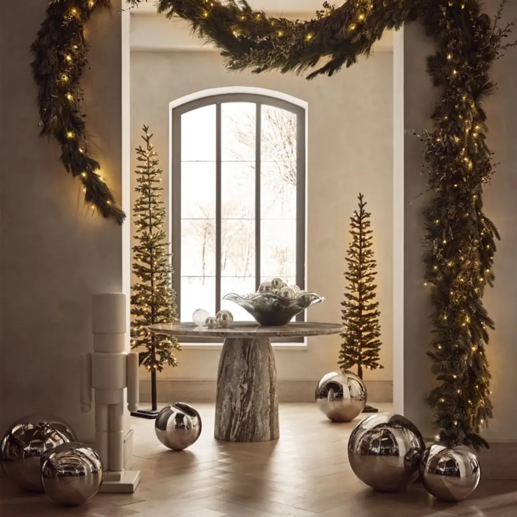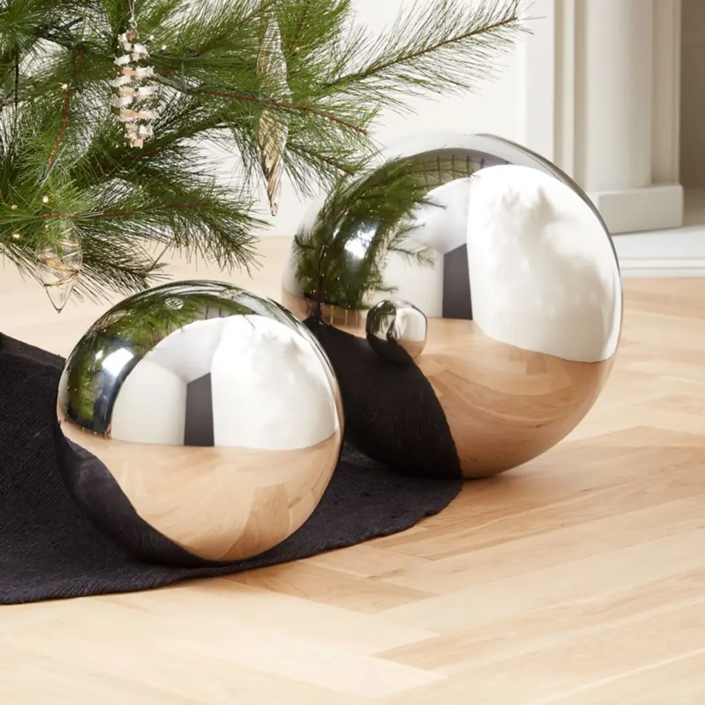 Seemingly plucked out of a pop art installation, silver orb is a study in optical illusion. Crafted of stainless steel with a highly polished finish, sphere creates a brilliant kaleidoscopic reflection with its simple form. Styled alone or in multiples, polished orb is festive by the tree, but a moment all year long. CB2 exclusive.