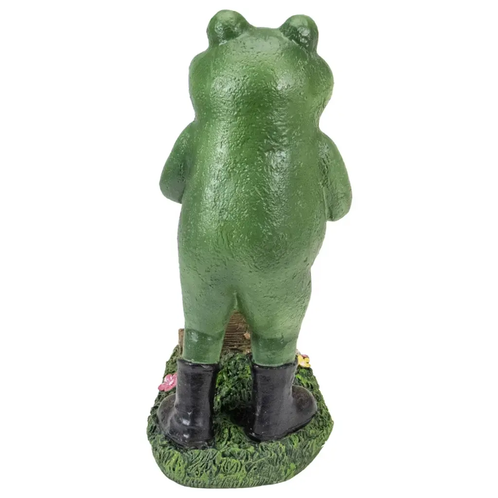 Add some whimsy to your garden with this adorable frog statue. Add a flower to the wheelbarrow for added color or fill with birdseed. Perfect to dress up any garden or patio space. Frog pushing wheelbarrow garden statue Durable weatherproof resin material For use indoor o outdoor Dimensions: 11.5"H x 4.25"W x 8"D Wheelbarrow: 2.5"L x 2"W x 1.5"D Material(s): polyresin
