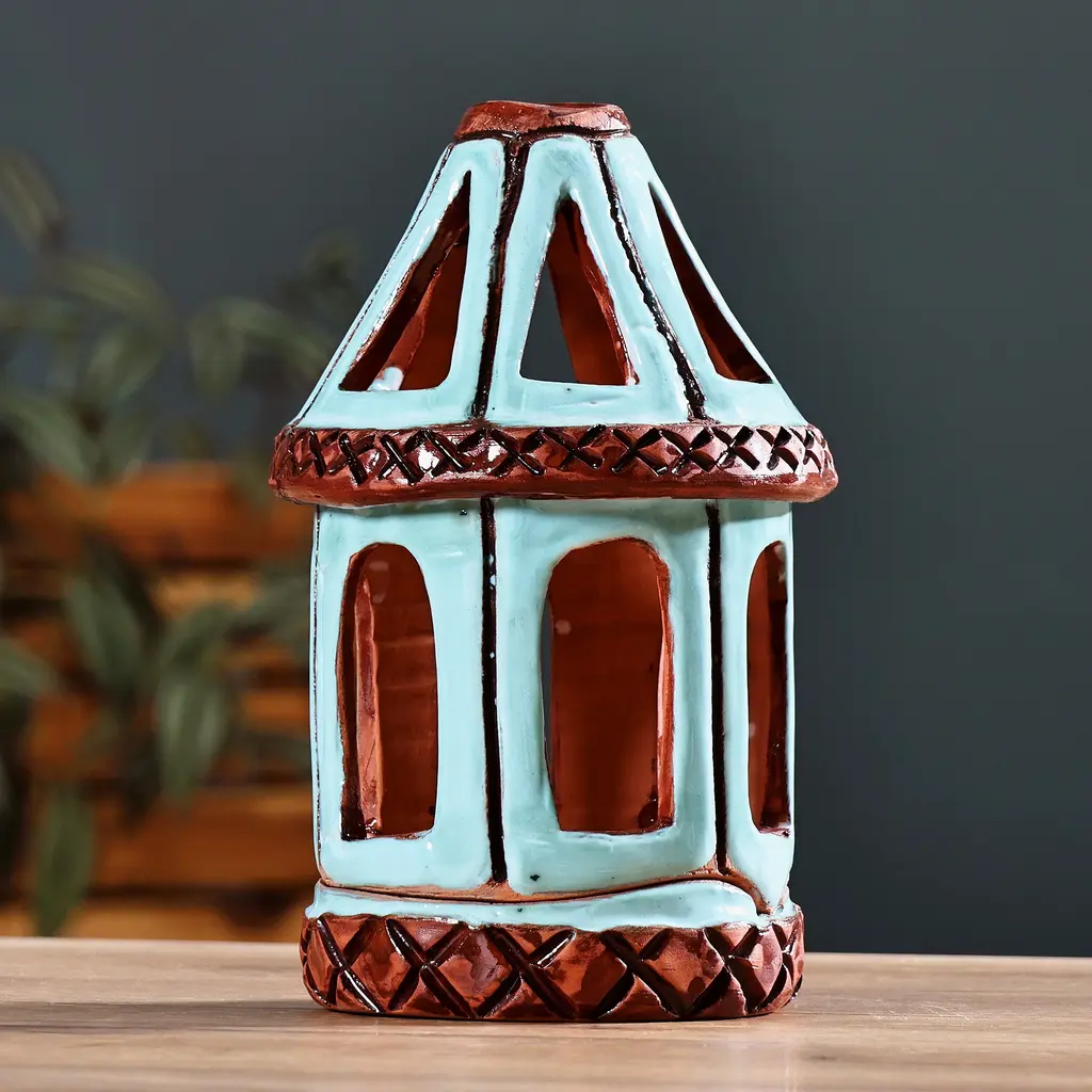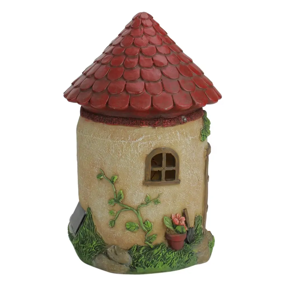Add a touch of spring whimsy to your outdoor or indoor garden with this whimsical mushroom style house. The brown mushroom house has the look of a traditional stucco house with a red roof. There are two lights above the front door and the windows glow with a soft amber color. The outside of the house has details of a tree with a swing, vines, a potted flower, and a pumpkin. This little mushroom house truly will make any garden a truly magical place. Product Features: Round mushroom-esque house with a red roof garden statue Pre-lit by 3 amber colored lights Mushroom house features a tree with a swing, potted flower, pumpkin, and a vine House is surrounded by green grass and stones Meticulously sculpted by highly skilled artisans with fine attention to detail For indoor and outdoor use Dimensions: 11.5" high x 7" diameter Material(s): polyresin