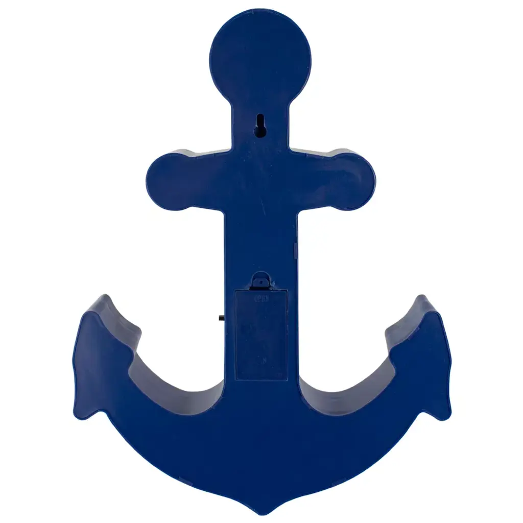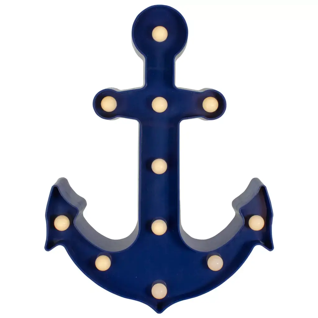 Light up your desk, mantle, or wall with this fun, nautical anchor marquee sign. The sign is lined with warm white, LED lights that give off a soft glow. Perfect as a night light for the little nautical lover in your life! Product Features: Illuminated by LED lights Color: warm white bulbs One-sided design LED lights use up to 80% less energy Bulbs stay cool to the touch Requires 2 "AA" size batteries (not included) Convenient on/off switch on the side Comes ready-to-hang with a keyhole hook on the back Recommended for indoor decorative use only Dimensions: 12.5"H x 9.5"W x 2"D Material(s): plastic