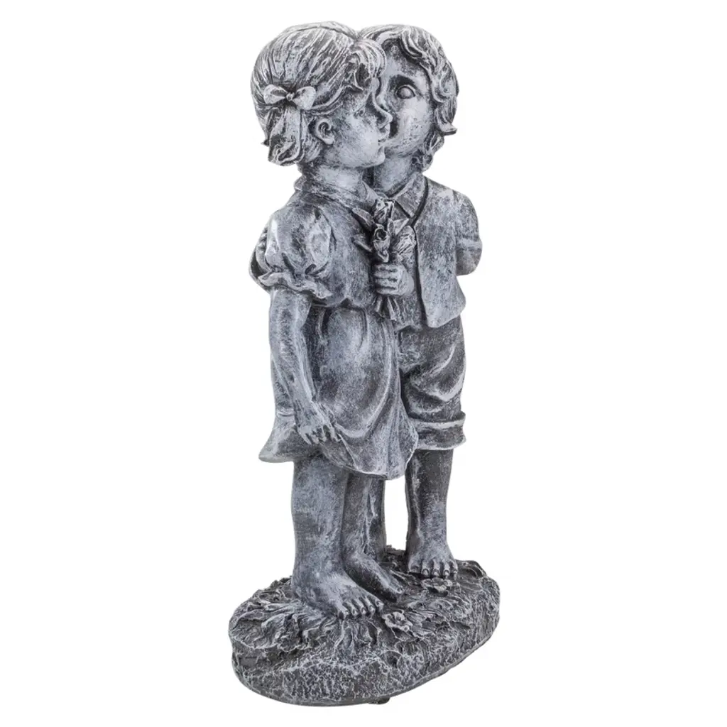 This well done statue is the epitome of innocence. A young boy steels a kiss on the cheek after giving a little girl flowers. Meticulously detailed, this statue is a must have in any garden or patio. Peck on the cheek outdoor garden statue Intricate details from skilled casting Has a real stone look Made from durable weather resistant resin For indoor or outdoor use Dimensions: 12.5"H x 7"W x 4"D Material(s): polyresin