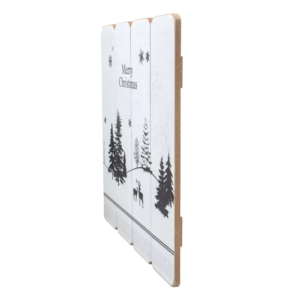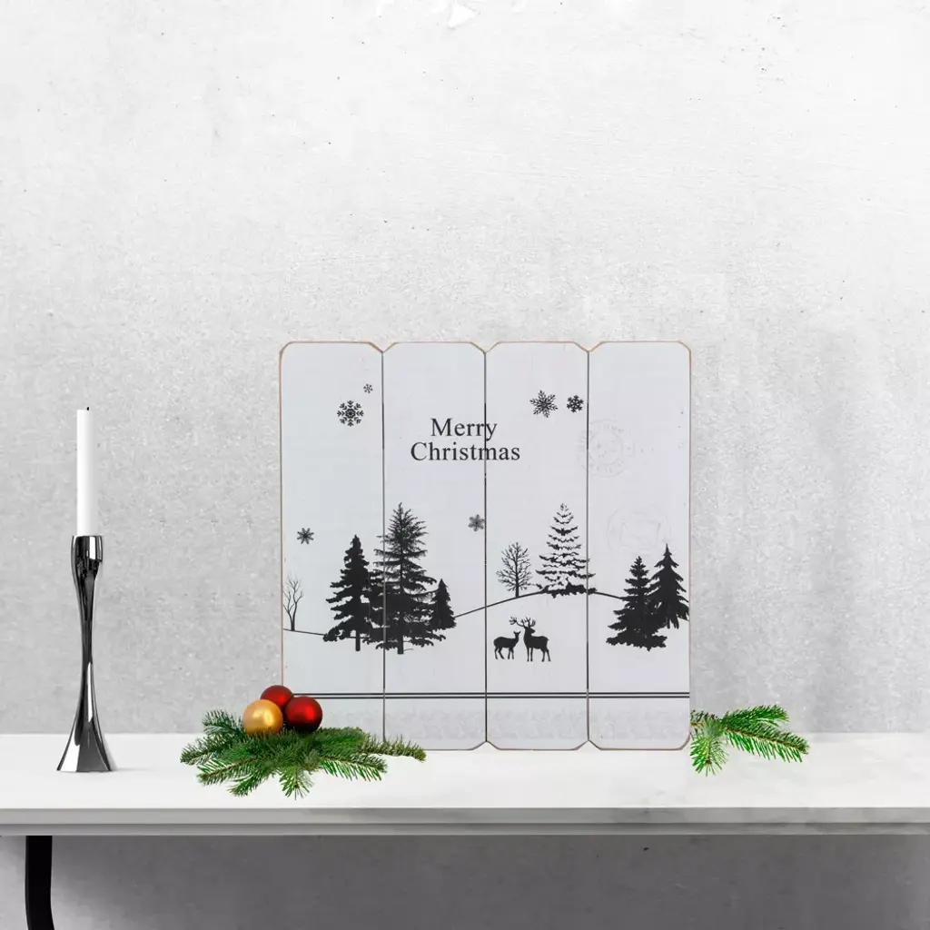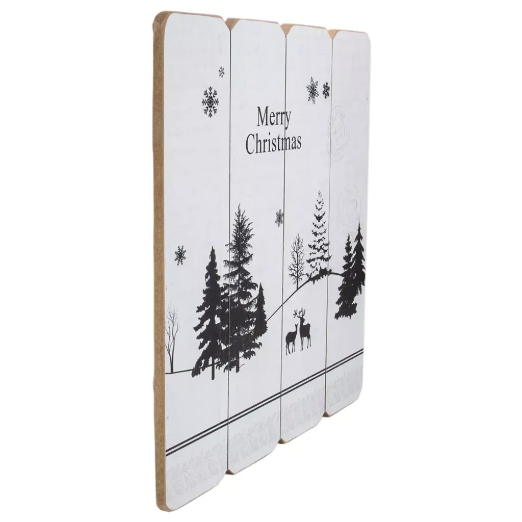 Give your home a nostalgic flair this winter with this unique wall sign. It features a black and white winter scene with deer and trees with snowflakes falling down. The background resembles a postcard with writing and postal stamps which leaves a nostalgic flair for the romantic heart. Product Features: White and black wooden holiday wall sign Features black printed deer, trees and snowflakes Black script reads “Merry holiday” Background has script printing and postal stamps Floral border pattern at the bottom Equipped with a fish-eye hook at the back for hanging Recommended for indoor use only Dimensions: 16”H x 16”W x 0.25”D Material(s): wood