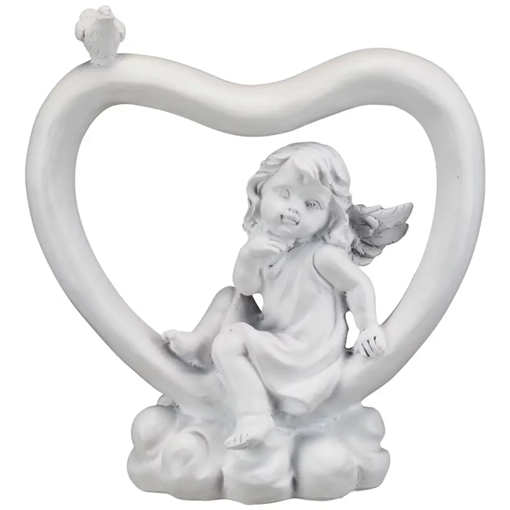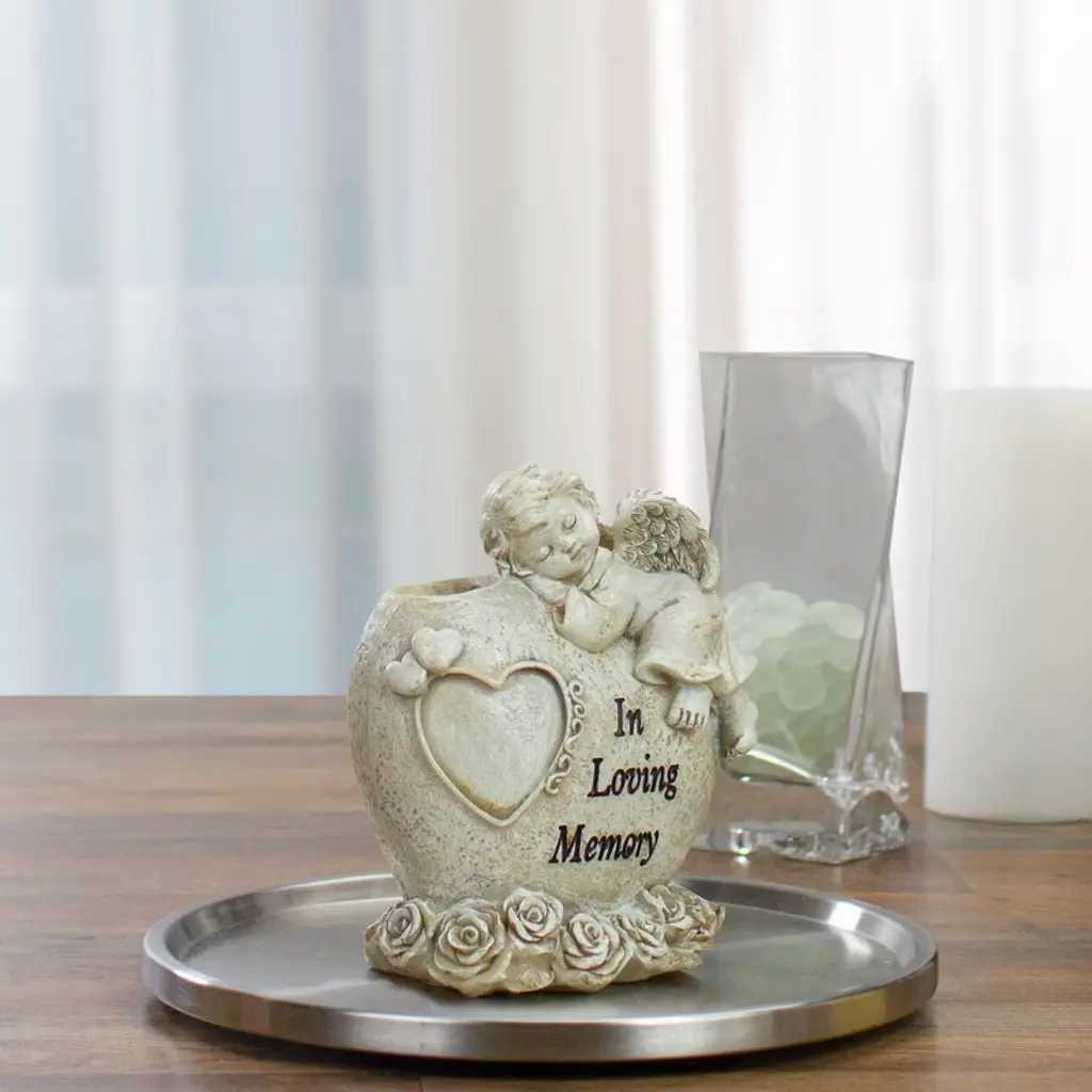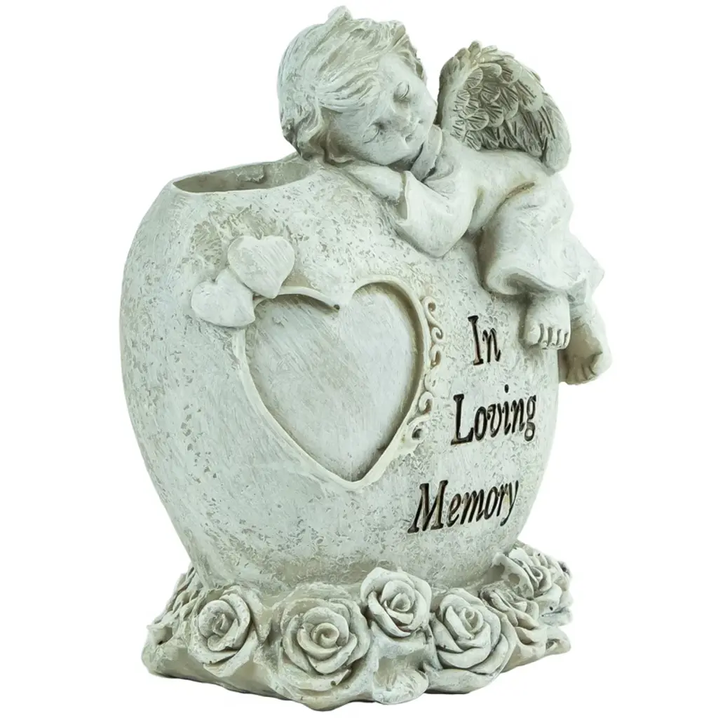 Add a touch of charm and warmth to your patio or home decor as you usher in the delightful seasons of spring and summer with this enchanting cherub statue. Crafted with intricate detail, the statue portrays a serene sleeping cherub, adorned with delicate hearts and blooming flowers, evoking a sense of innocence and tranquility. The inclusion of a bud vase provides a perfect spot to showcase your favorite blossoms, infusing vibrant hues and fragrances into your space. Whether placed in your backyard, front yard, garden, porch, or even indoors, this statue is sure to captivate hearts and elevate the ambiance with its timeless appeal, making it a delightful addition to any setting. Product Features: Cherub with bud vase garden statue Features a peaceful angel resting upon a heart-shaped stone The base features detailed roses Stone is inscribed with the words "In Loving Memory" Has a bud vase for flowers Has intricate details that provide a realistic look Recommended for indoor or outdoor use Dimensions: 6.5"H x 5.50"W x 3.5"D Vase opening: 1.50" diameter Vase depth: 2.75" deep Material(s): polyresin