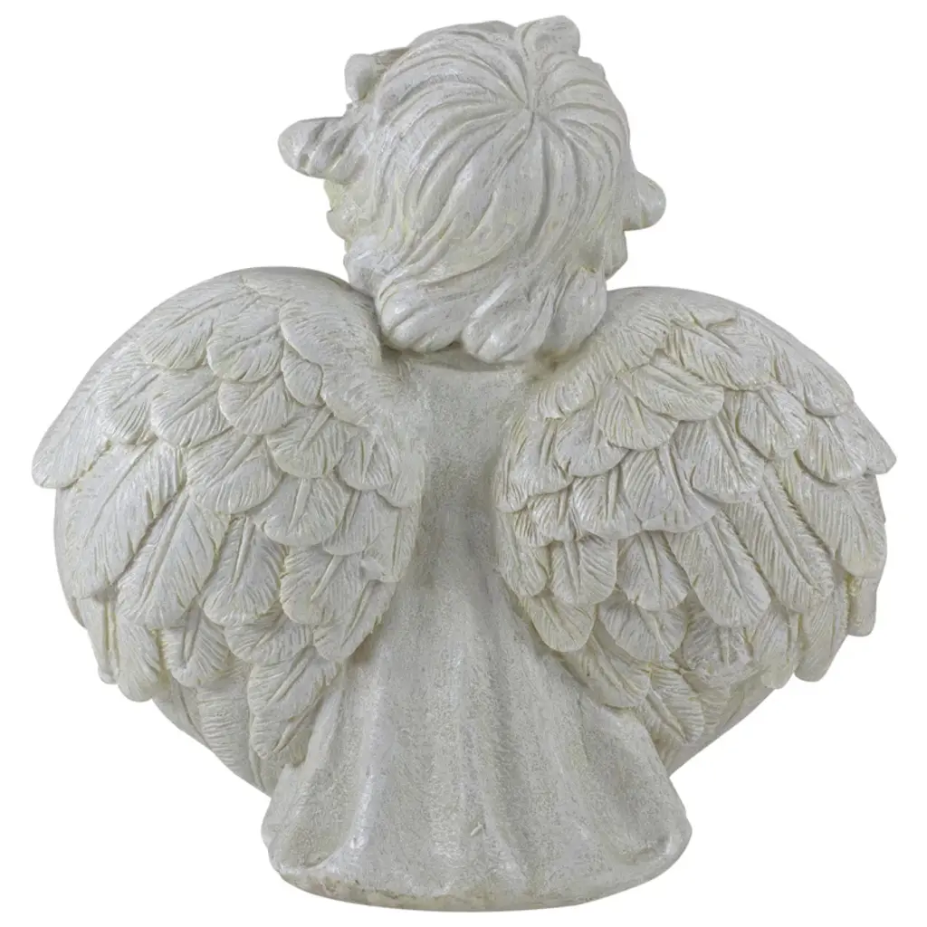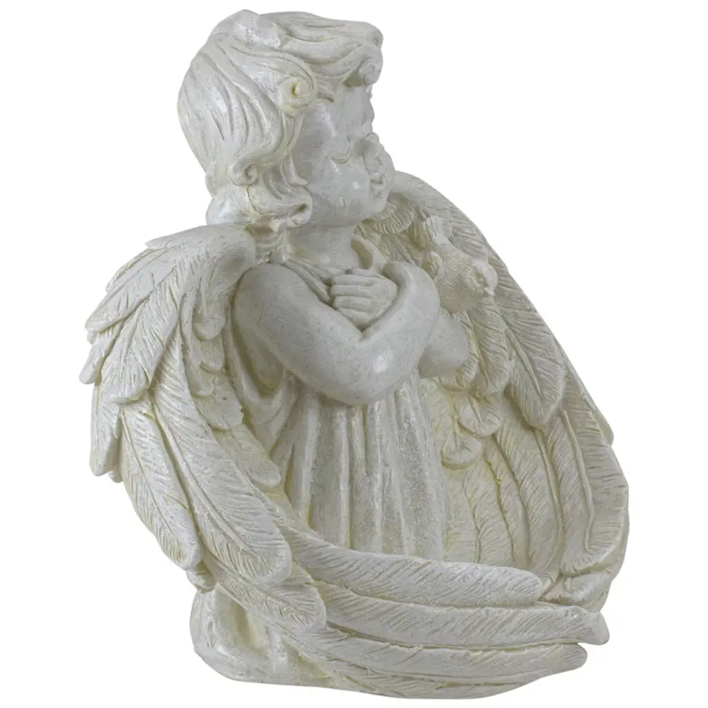 Welcome spring and summer to your patio or home decor with this angelic garden statue. Adding a cherub angel to your outdoor space will bring peace and serenity to your garden. Your home will be the favorite for the neighborhood birds when they visit this bird feeder. Features: Features a cherub angel with folded wings Angel has a bird perched on her arm Folded wings create the bird feeder bowl Designed with a distressed ivory finish Meticulously sculpted by highly skilled artisans with fine attention to detail Dimensions: 9"H x 9"W x 6"D Material(s): polyresin