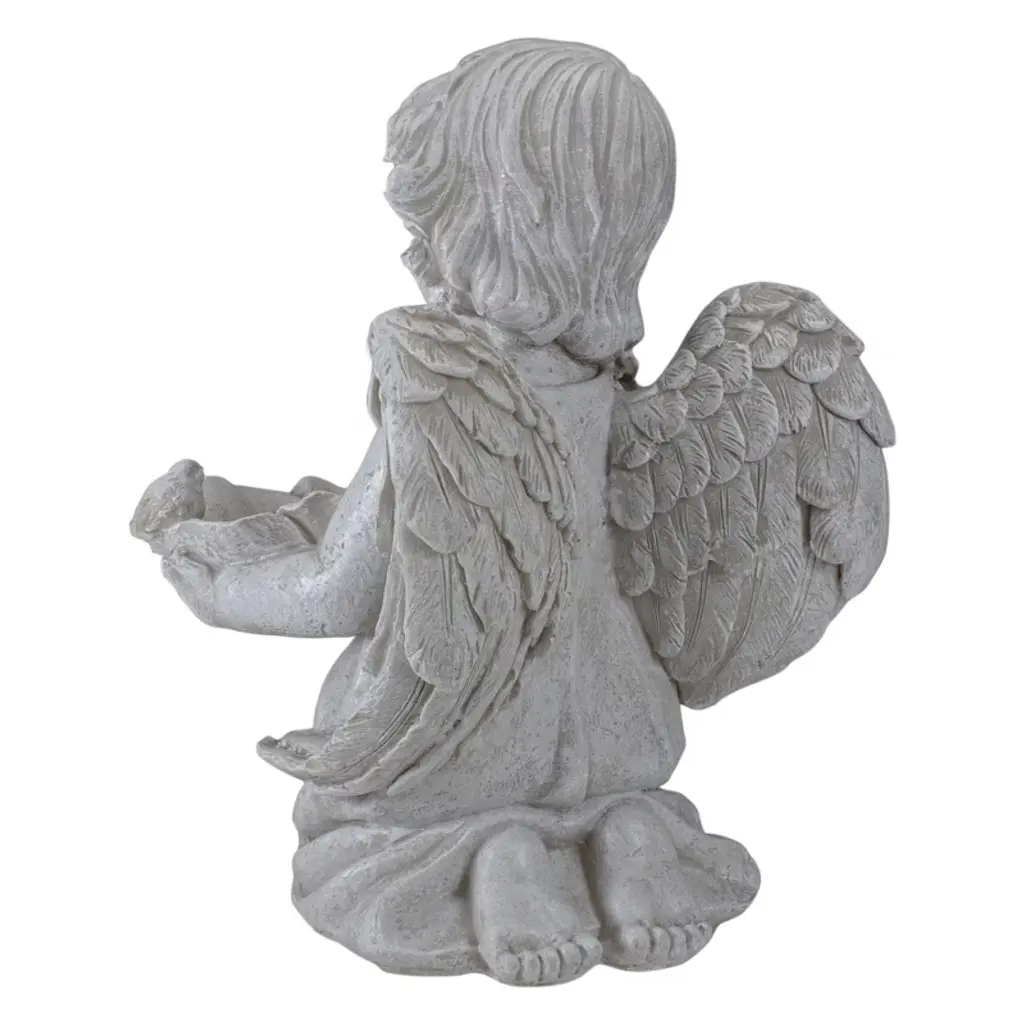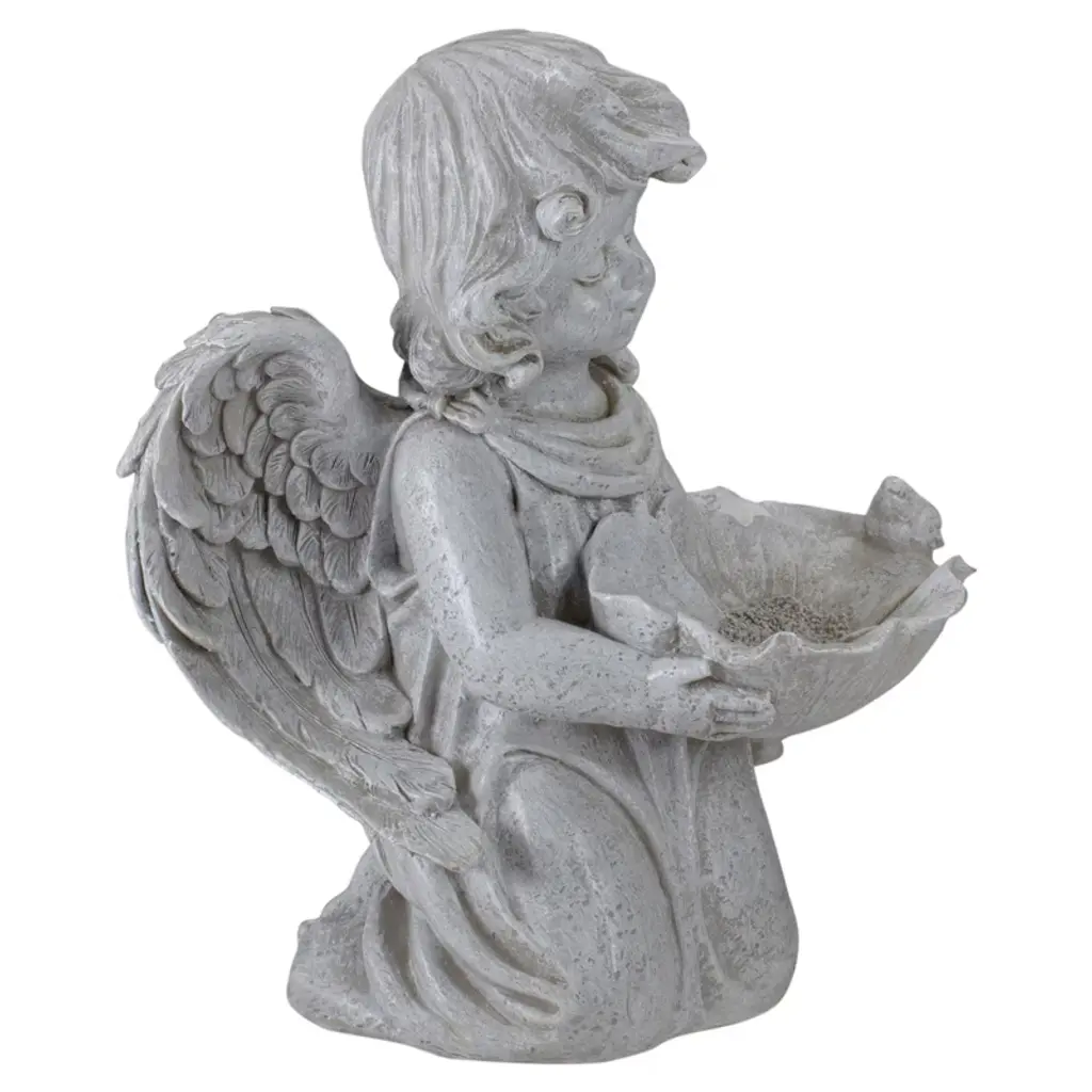 Welcome spring and summer to your patio or home decor with this angelic garden statue. Adding a cherub angel to your outdoor space will bring peace and serenity to your garden. Your home will be the favorite for the neighborhood birds when they visit this bird feeder. Features: Features a cherub angel with wings Angel is holding the flower shaped feeder A bird is perched on the edge of the feeder bowl Made with a distressed white and gray finish Meticulously sculpted by highly skilled artisans with fine attention to detail Dimensions: 9.5"H x 7"W x 7"D Material(s): polyresin