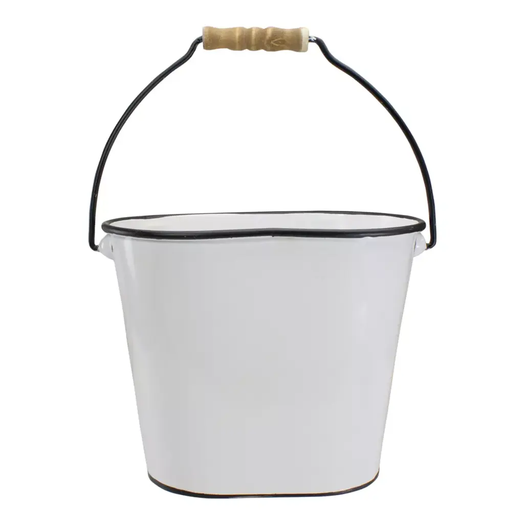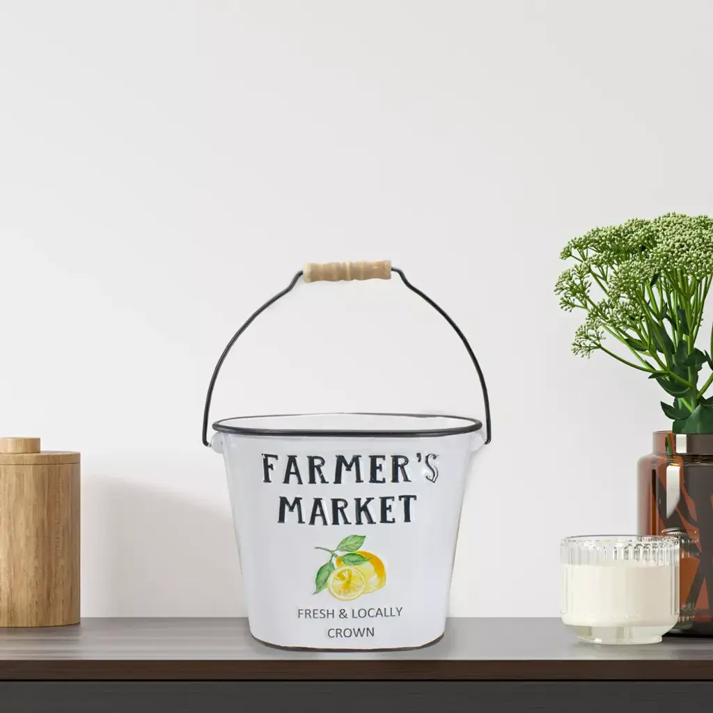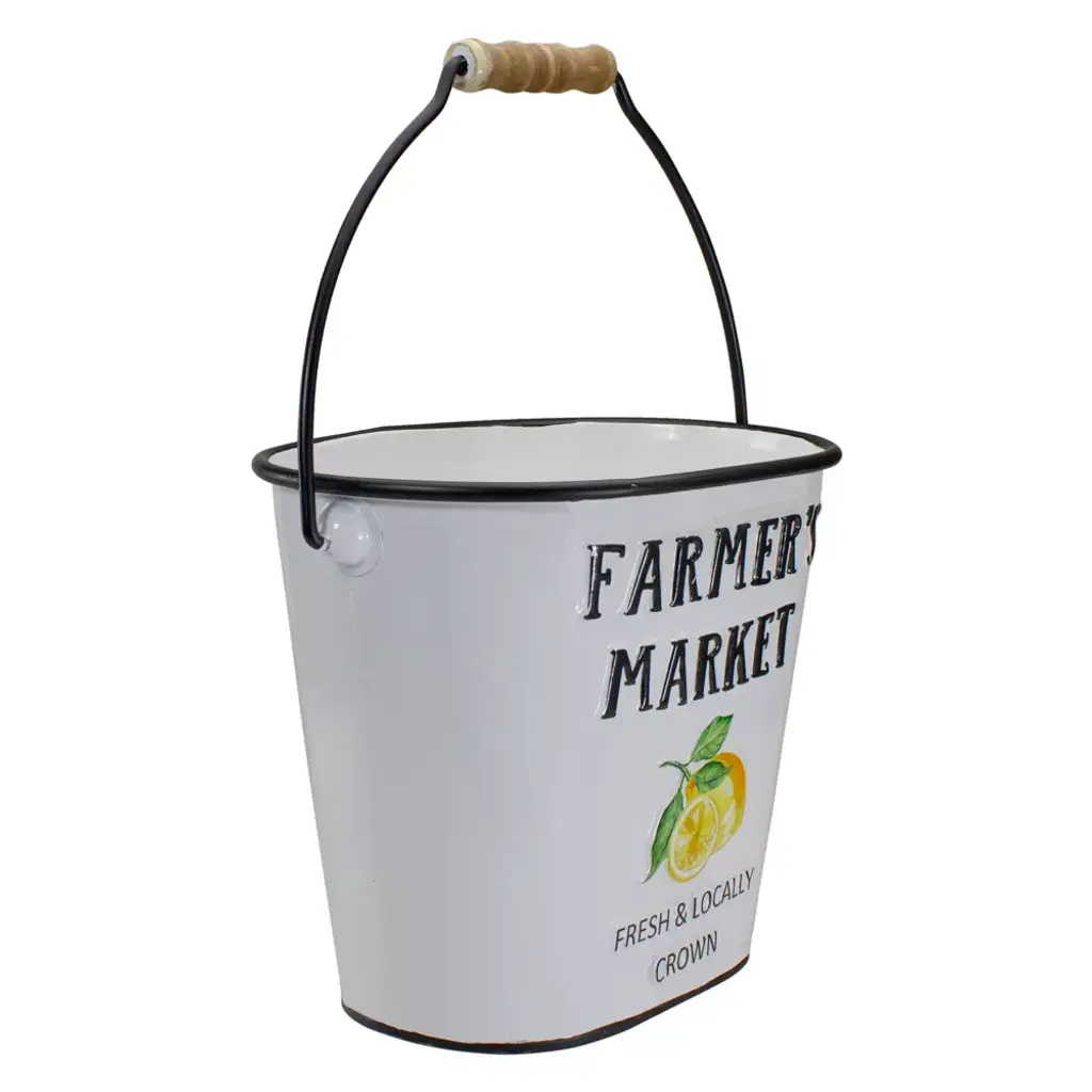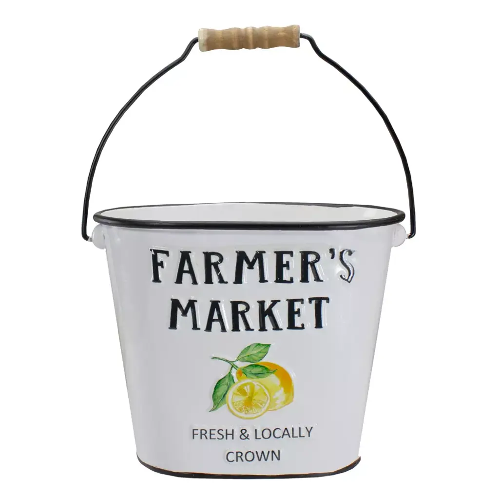 This farmer's market bucket will add a country rustic touch to your decor. This bucket will not only be a functional storage solution but can be carried with its decorative handle. This bucket is metal-constructed and can hold just about anything. Features: Oval shaped top Metal constructed Shiny white and black finish With wooden accented handle Reads "Farmer's Market" Also reads "Fresh & locally crown" Features bright yellow lemons No assembly required Recommended for indoor or outdoor use Dimension: 7.75"H x 10.5"W x 6.5"D Inner Dimensions 9" wide x 6" deep Materials: metal/wood