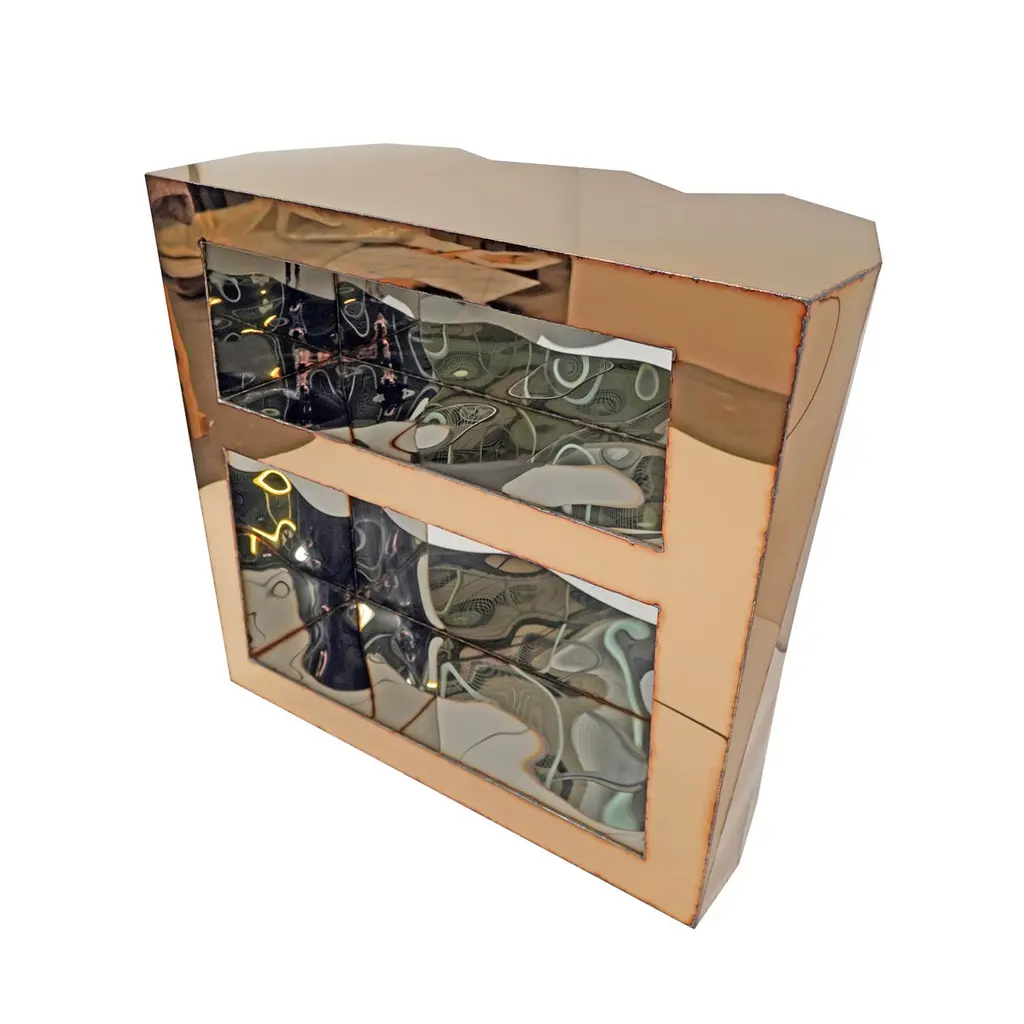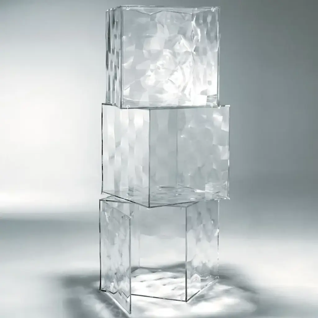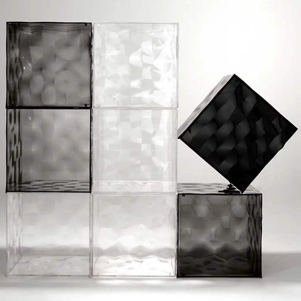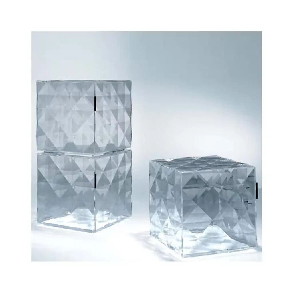 The Kartell Optic Cube Storage designed by Patrick Jouin is an exciting faceted cube with its transparent and mirrored parts that create a special reflected atmosphere. Optic is a container cube which comes in two versions: closed with a door or open without a door. Its surface is strikingly decorated with square based pyramids which whether transparent or mirrored create a strong visual impact.