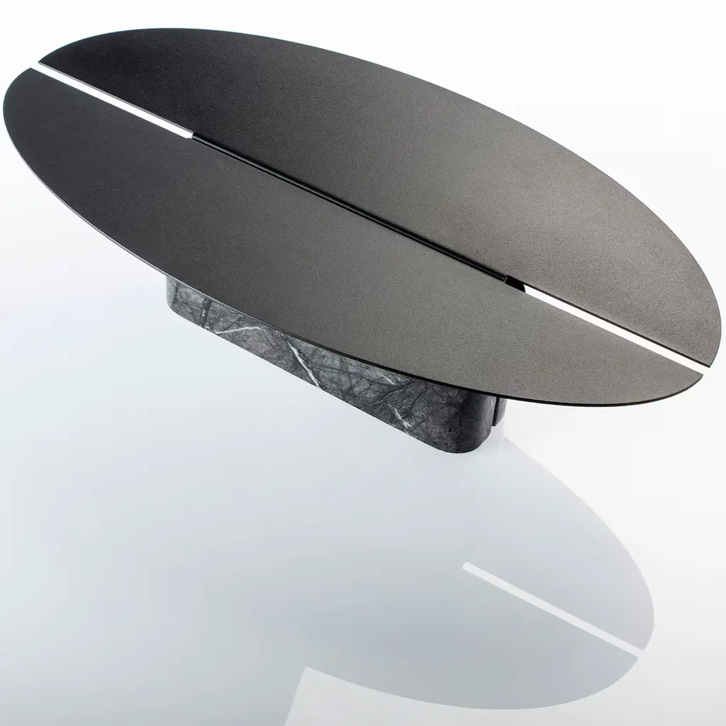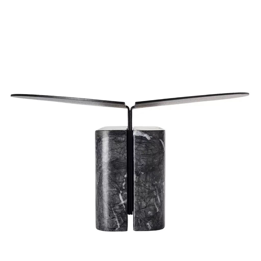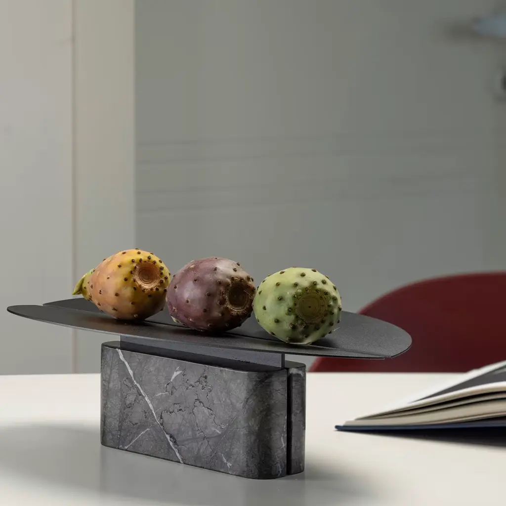 Inspired by the celebrated painting by Gustave Courbet, this extraordinary centerpiece pays homage to the strength and beauty of the feminine universe. Designed by Alessandra Grasso, it features a solid and refined Gray Carnico marble base on which rise two metal sheets shaped as feminine labia, slightly sloped in order to firmly hold fruit, bread, or dry flower compositions. Also available in Red Antico marble upon request to the Concierge.