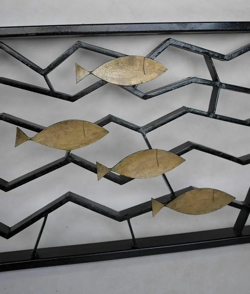 Pair of Metal Geometric fence or art object with golden fish made in Italy, circa 1950s. Priced per piece.
