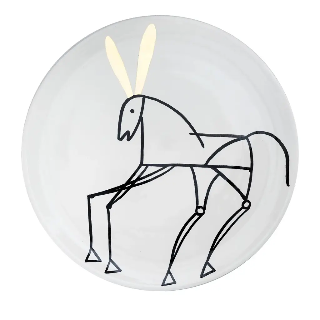 Simultaneously an artwork and a delightful ceramic plate, this round design conceived by designer Mimmo Paladino is minutely crafted by Ceramica Gatti's expert craftsmen. The hand-painted black profile of a stylized horse with ears in resplendent, pure gold stands out from the luminous background of fine white ceramic resulting in a superb decoration.