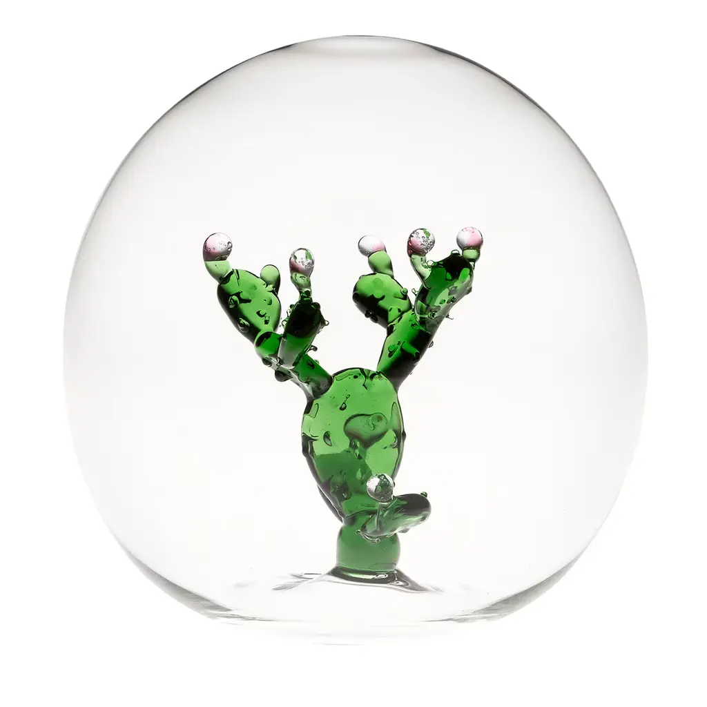 Characterized by a unique use of color, this figurine features a strikingly shaded petrol green frog resting on a transparent sphere enhanced by dancing bubbles encased within the layers of glass. This sculptural objet d'art is entirely handcrafted of glass by master artisans.