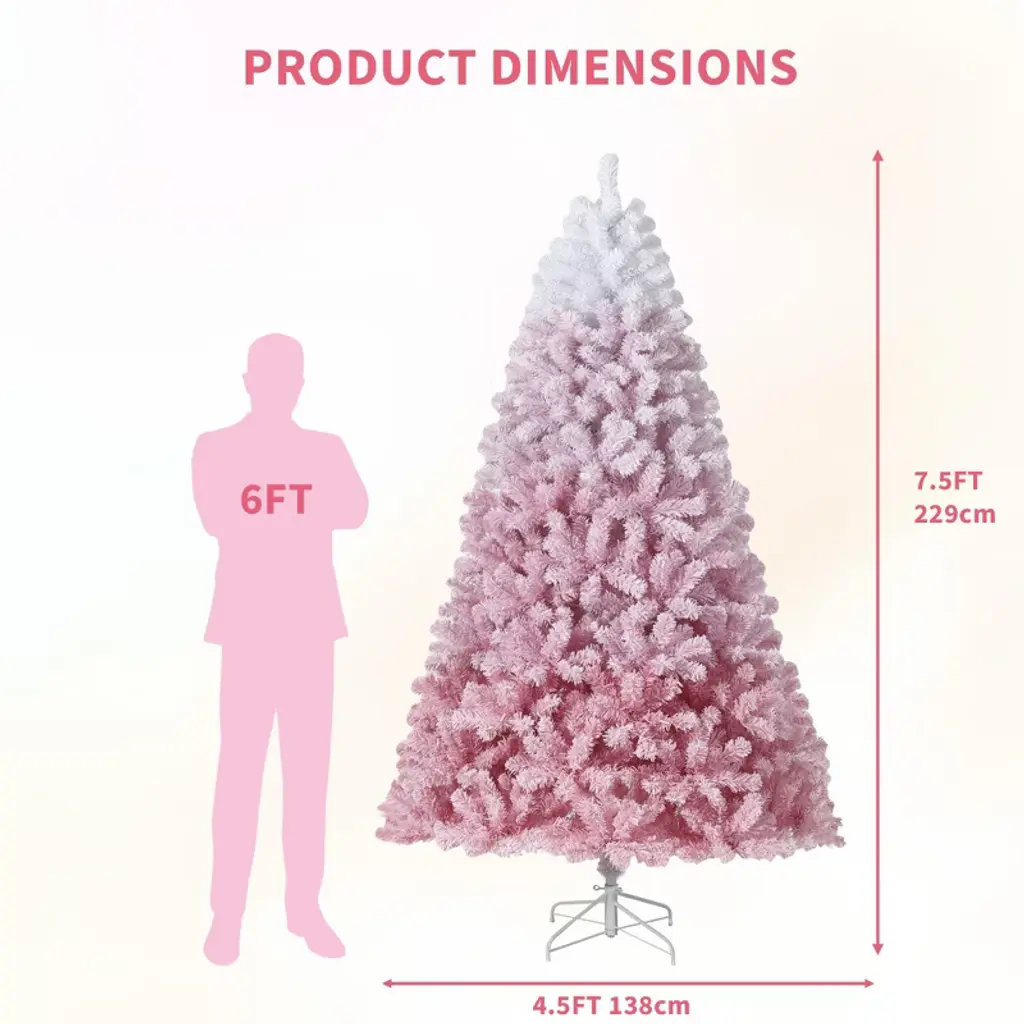 Pink Christmas Tree, 7.5ft Pre-Lit Snow Flocked Artificial Christmas Tree with Warm White LED Lights - Gradient Pink Xmas Tree with Metal Stand for Home, Office, Party DecorBrand: TruAIRTree Height: 7.5 Feet (90 Inches)Bottom Width: 55 InchesPackaged Dimensions: 88.58"D x 44.29"W x 44.29"HColor: Pink Gradient (Deep Base to Light Tips)Item Weight: 39.68 PoundsLighting: Warm White LED Lights (Pre-Lit)Material: Flame-Retardant PVCStand: X-Shaped Metal BaseRecommended Use: IndoorProduct OverviewMake a festive statement with TruAIR¡¯s 7.5FT Pink Flocked Christmas Tree, featuring a stunning gradient pink design and pre-lit warm white LEDs. This eye-catching tree combines whimsical style with practical functionality, offering a snow-flocked finish that transitions from deep pink at the base to soft cherry pink at the tips. With its full hinged branches, sturdy metal stand, and effortless assembly, this tree is perfect for homes, offices, and holiday parties seeking a unique and joyful centerpiece.Key Features & Benefits1. Gradient Pink Flocked Design: Unique color transition from deep pink base to soft cherry pink tips Snow-flocked finish creates a magical winter wonderland effect Full fluffy branches provide ample space for ornaments and decorations Eye-catching centerpiece for themed holiday decor 2. Pre-Lit Warm White LEDs: Energy-efficient warm white LEDs pre-strung for instant ambiance Evenly distributed lighting enhances the tree¡¯s gradient color effect Eliminates the need for additional lights or wiring Creates a cozy festive glow for any setting 3. Durable & Safe Construction: Flame-retardant PVC materials ensure indoor safety Robust X-shaped metal stand provides maximum stability Hinged branches maintain shape season after season Designed for long-term use and storage 4. Easy Assembly & Fluffing: Simple three-step setup: connect base, stack sections, fluff branches Hinged design allows quick expansion and minimal manual adjustment No tools required for assembly or disassembly Saves time and effort during busy holiday seasons 5. Versatile Holiday Decor: Ideal for home living rooms, bedrooms, and entryways Perfect for office parties and workplace celebrations Creates a festive atmosphere for themed events and gatherings Complements traditional and modern decor styles